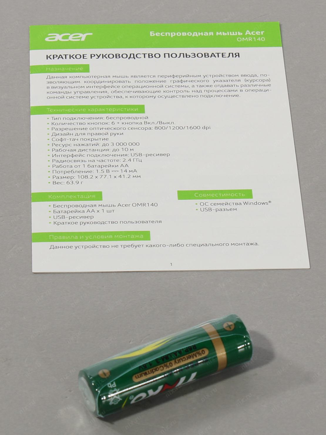 1 батарейка типа AA, USB-приемник