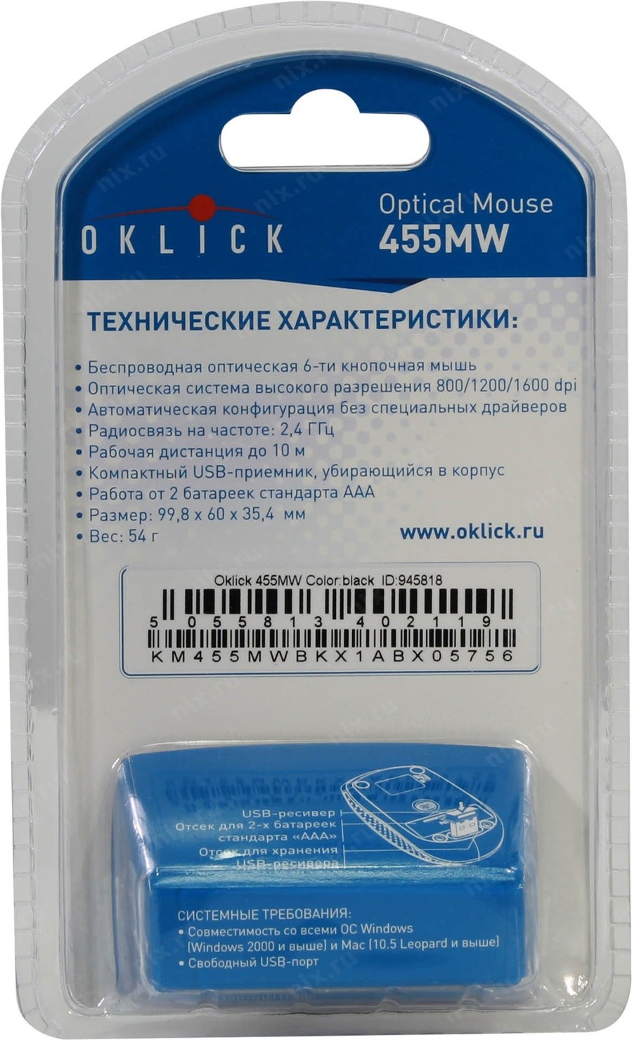 Мышь Оклик 455MW черный оптическая 1600dpi беспров. USB для ноутбука 6but (945818) OKLICK