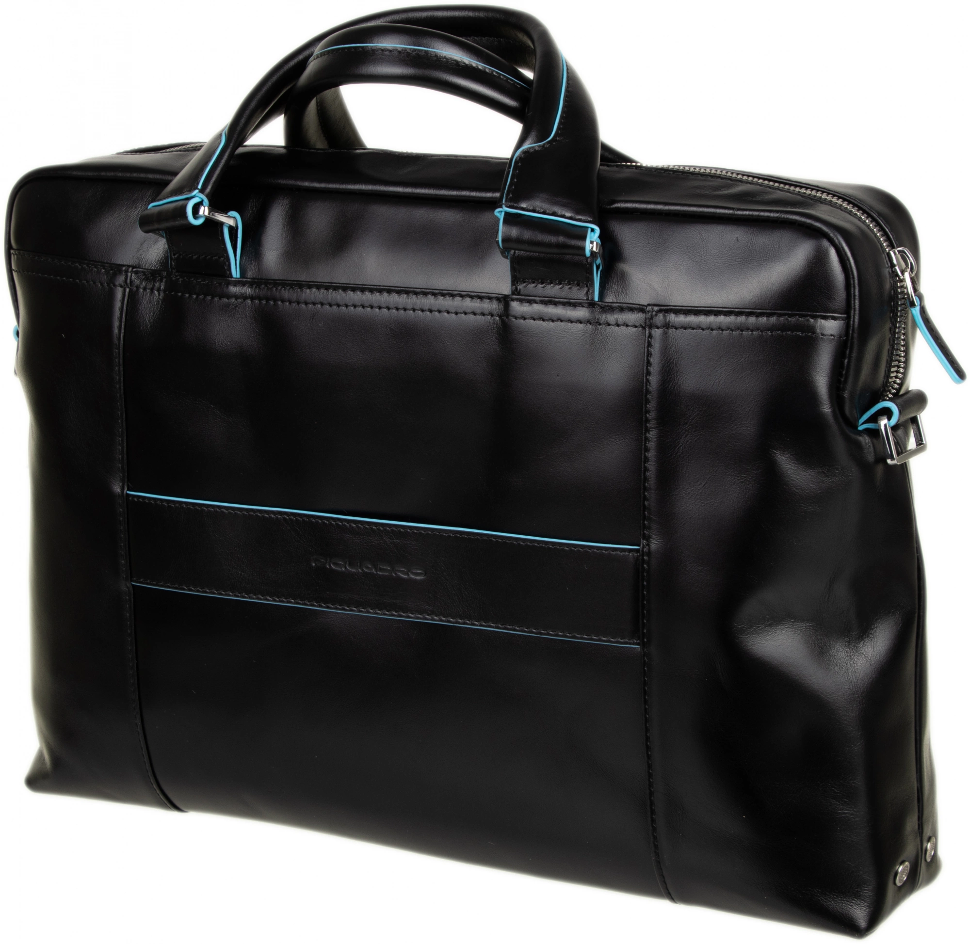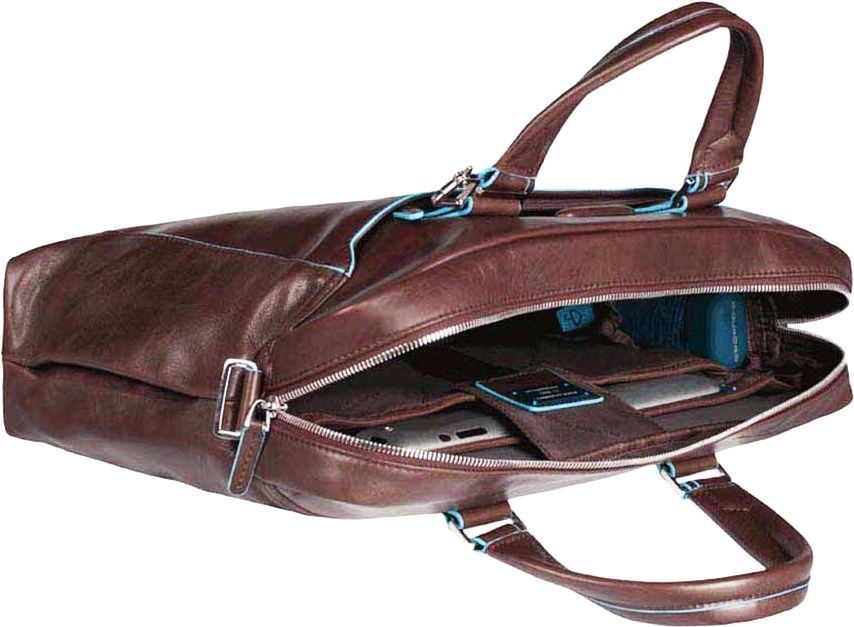 Сумка с двумя ручками из натуральной телячей кожи с голубой окантовкой. Съемный плечевой ремень. Одно основное отделение, отделения для ноутбука (13" ) и iPad / iPad Air. Органайзер, карманы для мелких вещей и зонта. Система крепления к ручке багажной сумки. Внешний большой карман на молнии