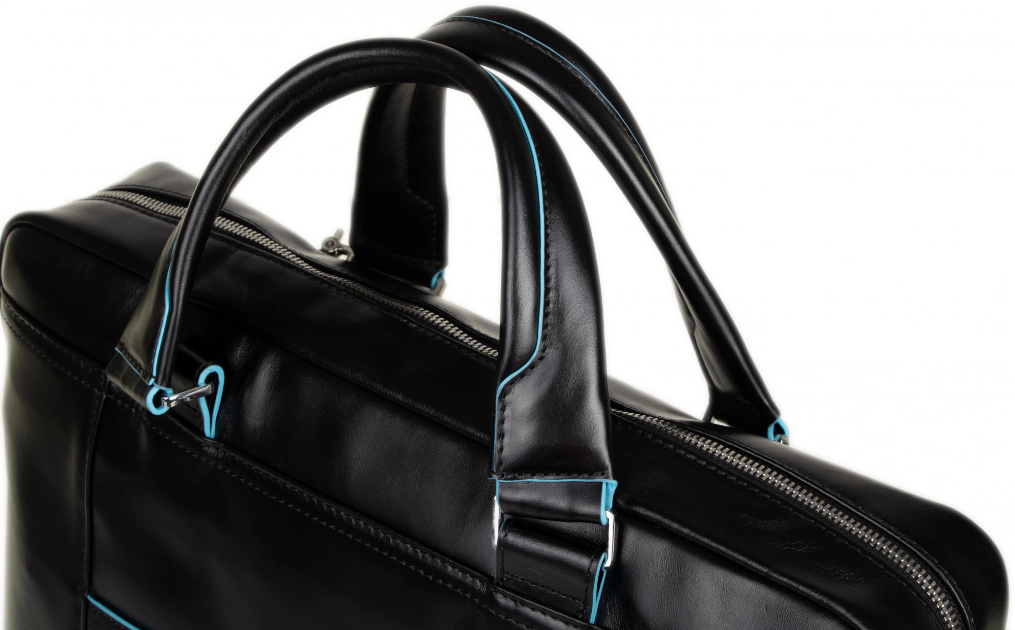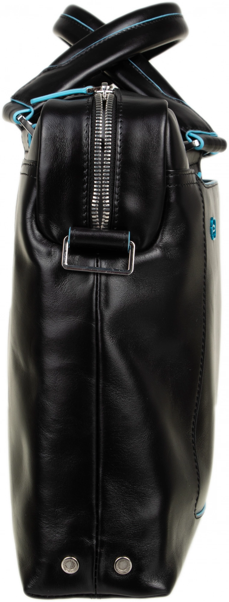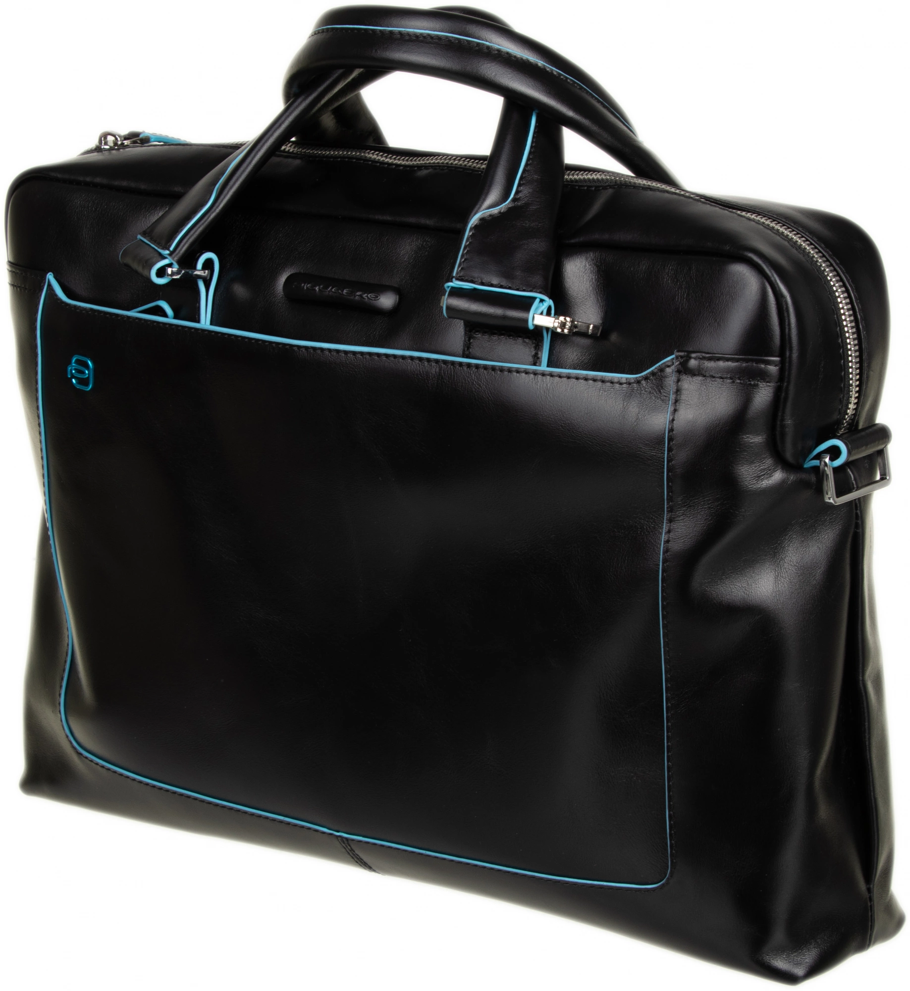 Сумка с двумя ручками из натуральной кожи с голубой окантовкой. Съемный плечевой ремень. Одно основное отделение, отделения для ноутбука (13" ) и iPad / iPad Air. Органайзер, карманы для мелких вещей и зонта. Система крепления к ручке багажной сумки. Внешний большой карман на молнии