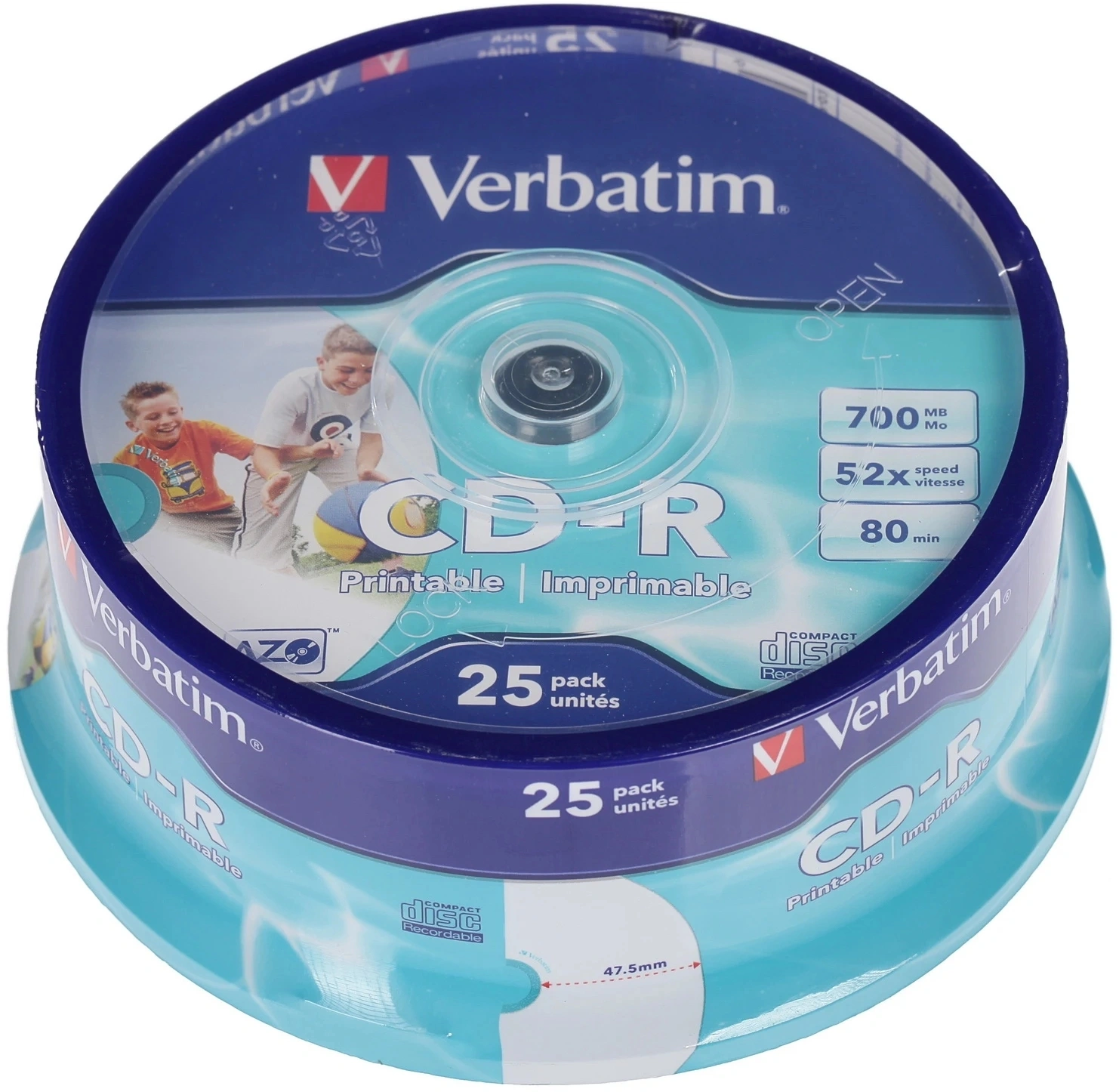 25 дисков однократной записи в пластиковой коробке. Возможна печать на дисках с помощью струйного принтера (принтер должен поддерживать печать на дисках)