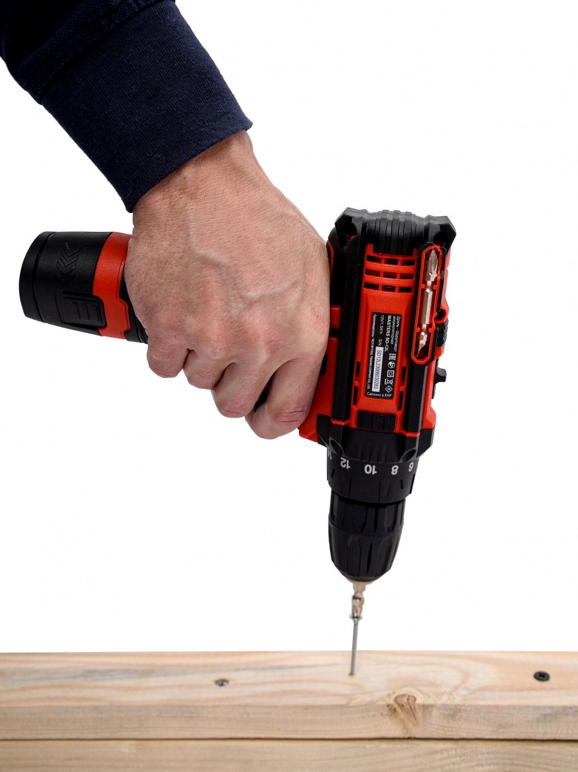 Аккумуляторная дрель-шуруповерт с аккумулятором; адаптер питания, бита 2 шт., крепление на пояс.