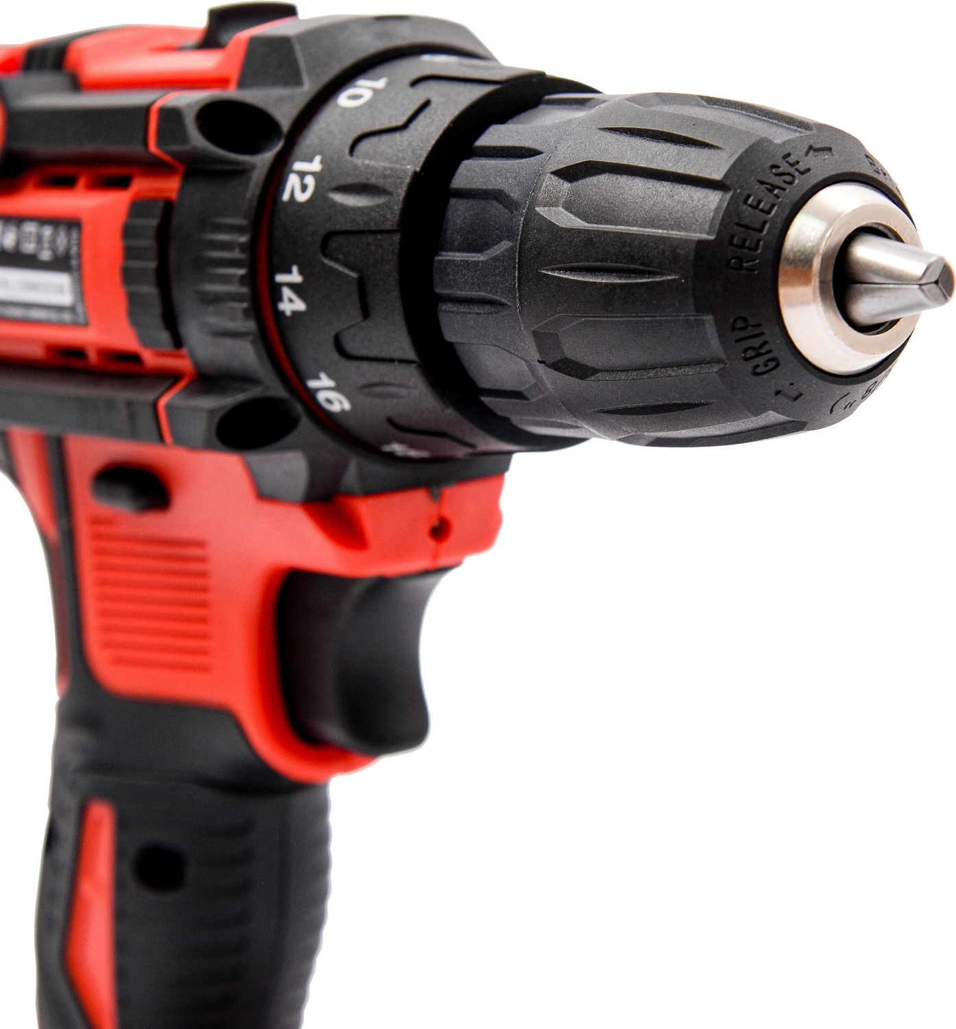 Аккумуляторная дрель-шуруповерт с аккумулятором; дополнительный аккумулятор, адаптер питания, бита 2 шт., крепление на пояс, ударопрочный кейс.