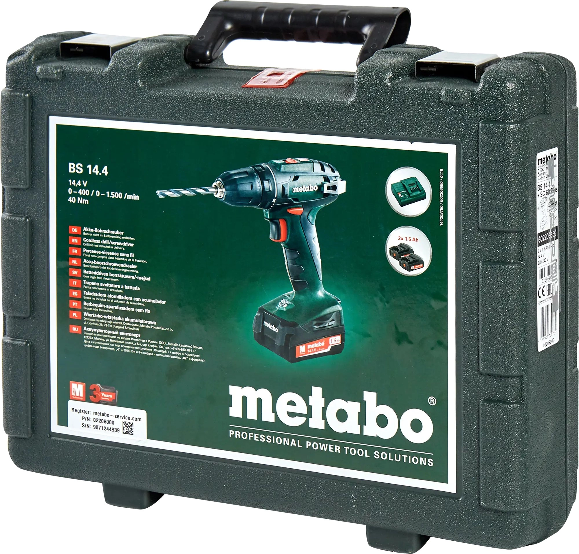 Дрель-шуруповерт, быстрозажимной сверлильный патрон; крючок для ношения на ремне; 2 аккумуляторных блока Li-Power (14, 4 В/ 1, 5 А*ч) ; зарядное устройство SC 30; пластиковый кофр.