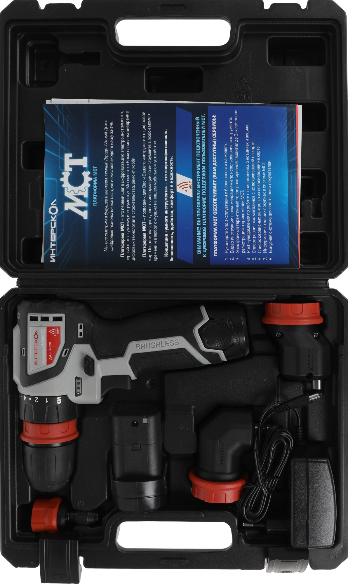 Машина ручная сверлильная аккумуляторная, патрон сверлильный БЗП, редуктор эксцентриковый насадка, редуктор угловой насадка, патрон для специальных сверл насадка, инструкция по безопасности и руководство по эксплуатации, гарантийный талон, батарея аккумуляторная, 2, 0 А.