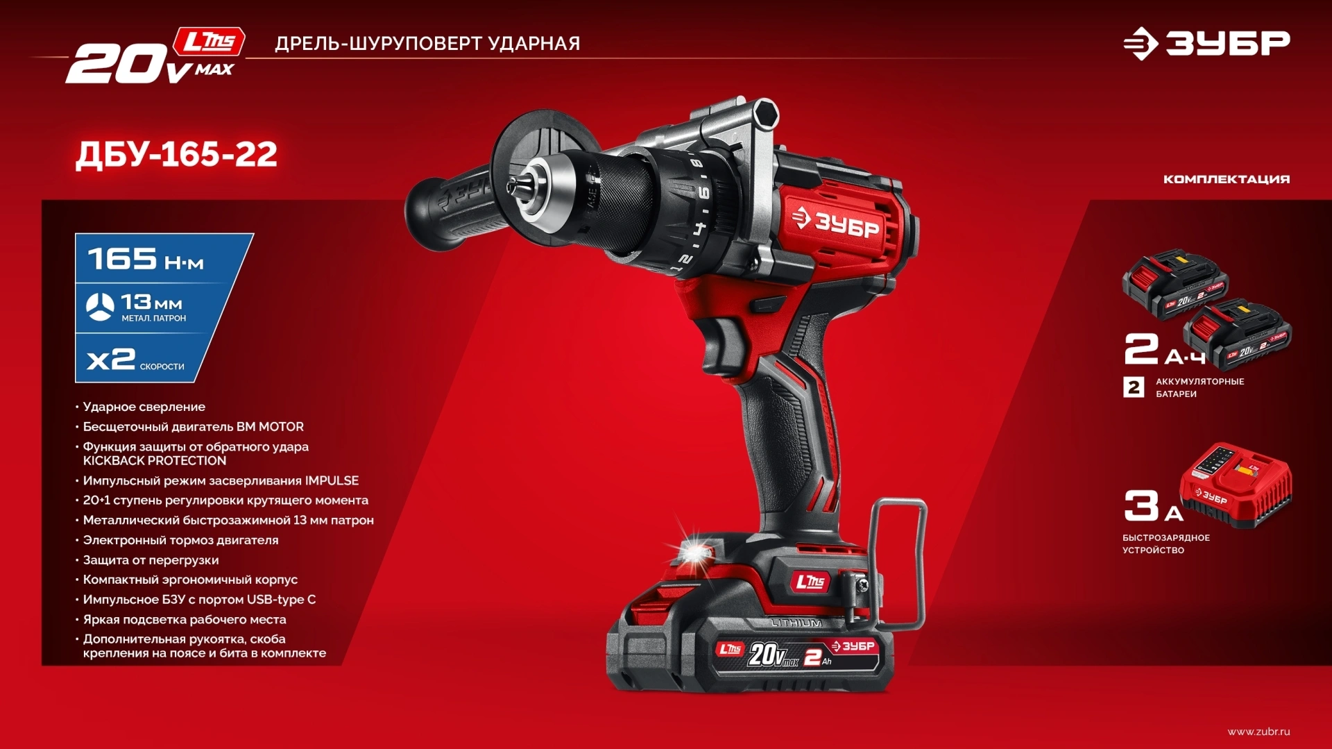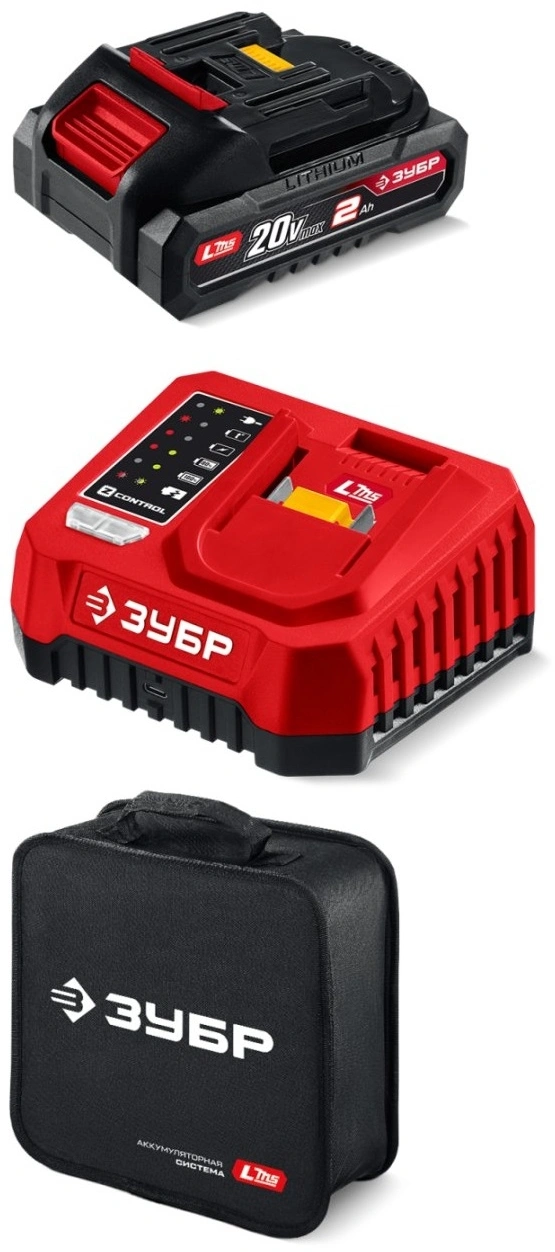Дрель-шуруповерт, рукоятка дополнительная, аккумулятор - 2 шт., зарядное устройство, бита, скоба крепления, сумка, руководство по эксплуатации.