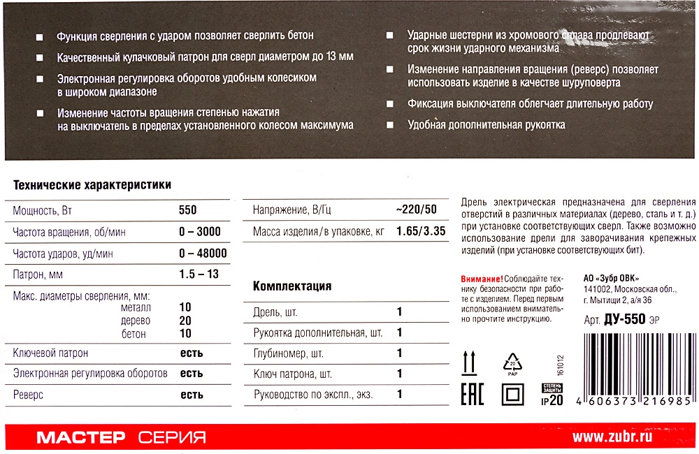 Дрель ударная Зубр ДУ-550 ЭР 550Вт патрон:кулачковый реверс