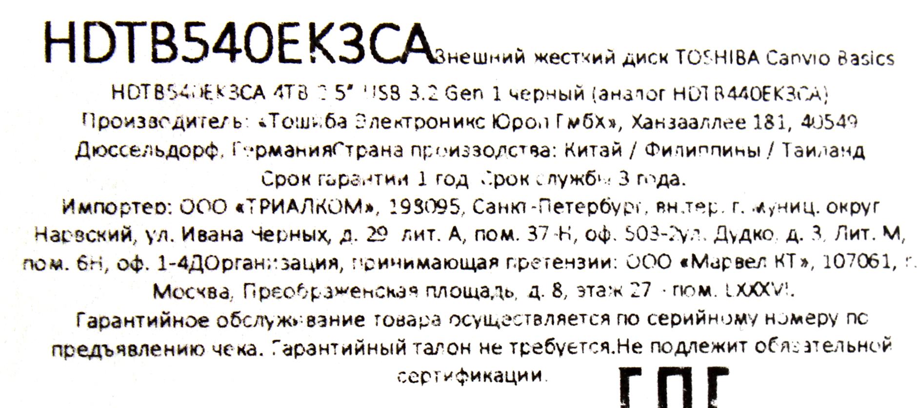 Внешний жесткий диск TOSHIBA Canvio Basics HDTB540EK3CA 4TB 2.5" USB 3.2 Gen 1 black (аналог HDTB440EK3CA)