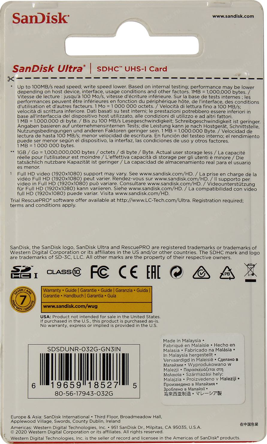 Флеш карта SDHC 32GB Sandisk SDSDUNR-032G-GN3IN Ultra