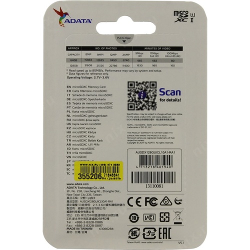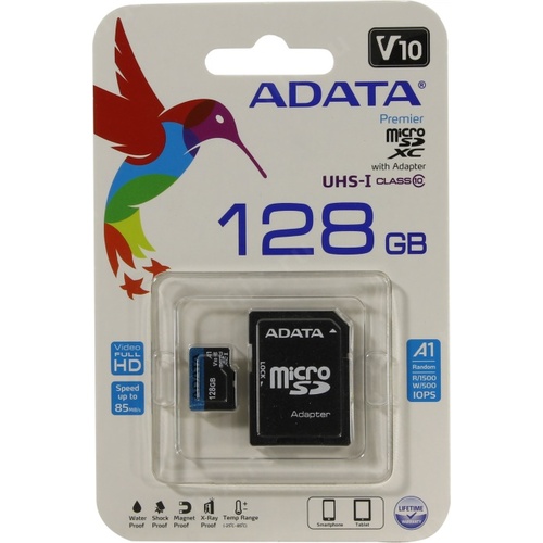 Карта памяти ADATA microSDXC 128GB ADATA Premier Memory Card AUSDX128GUICL10A1-RA1 UHS-I Class 10/V10 A1, 100/25 MB/s, AUSDX128GUICL10A1-RA1 Adapter, -25°C + 85°C, RTL (461940)