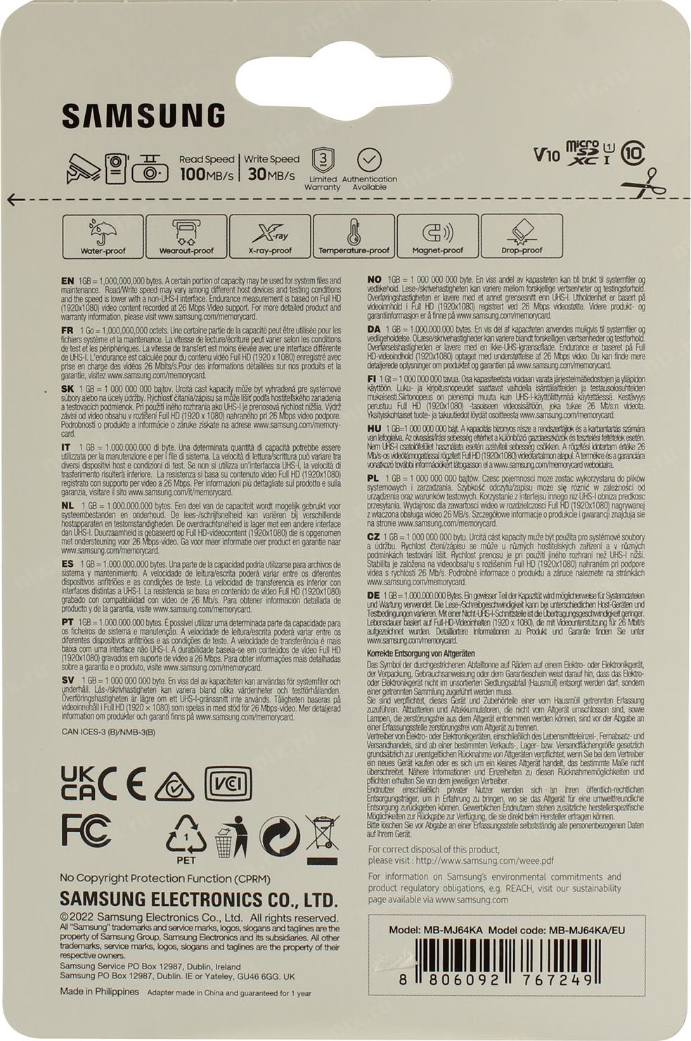 Карта памяти microSDXC с переходником в комплекте. Защищена от влаги, повышенной температуры, воздействия магнитного поля и рентгеновского излучения.