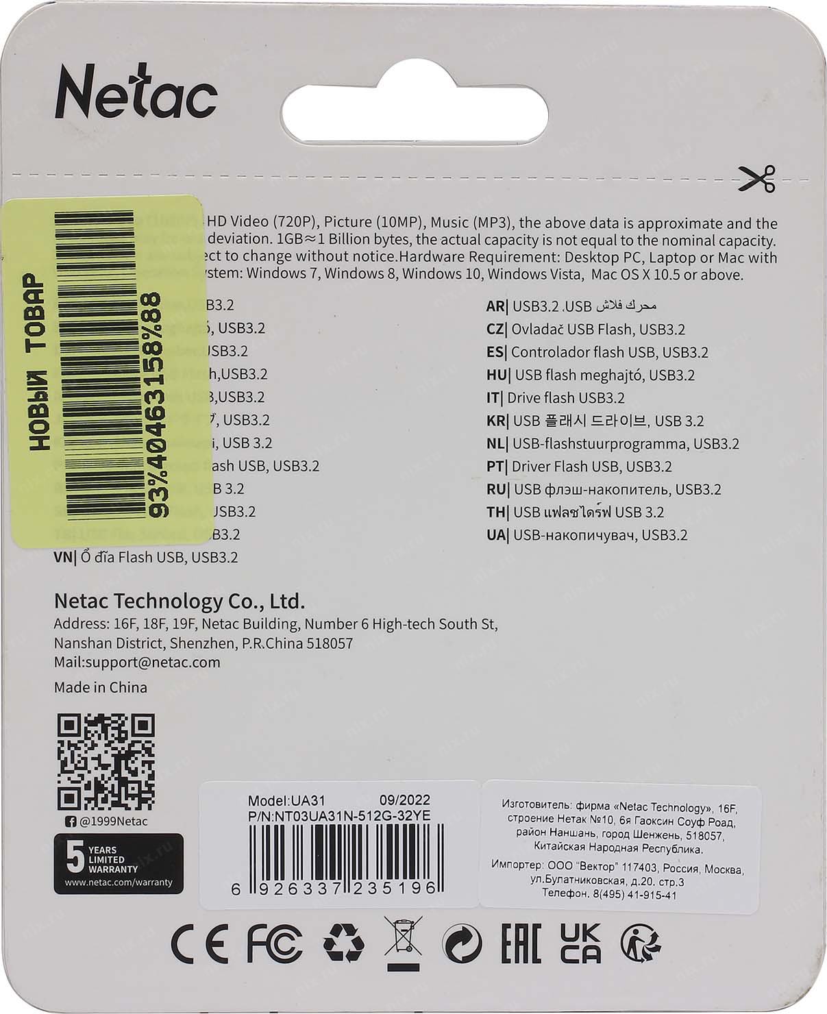 Флеш Диск Netac 512Gb UA31 NT03UA31N-512G-32YE USB3.2 желтый | НИКС Екатеринбург