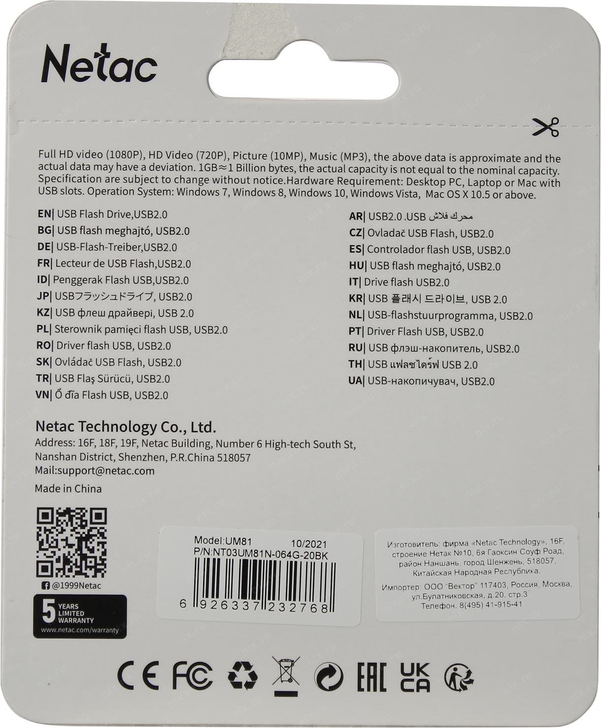 Флеш Диск Netac 64Gb UM81 NT03UM81N-064G-20BK USB2.0 черный