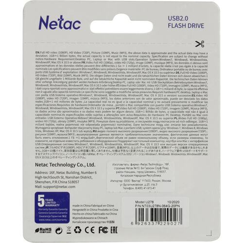 Флеш Диск Netac 64Gb U278 NT03U278N-064G-20PN USB2.0 серебристый