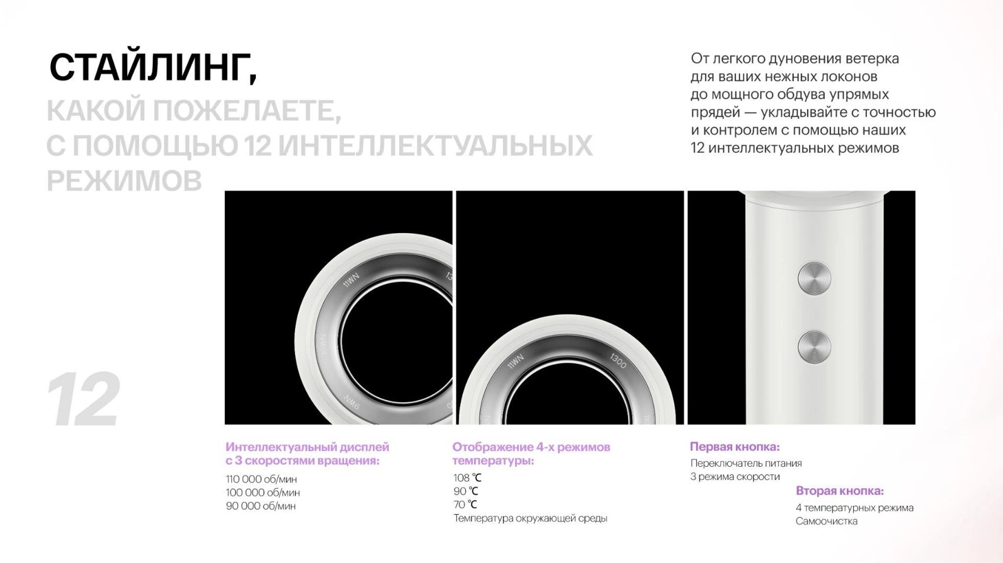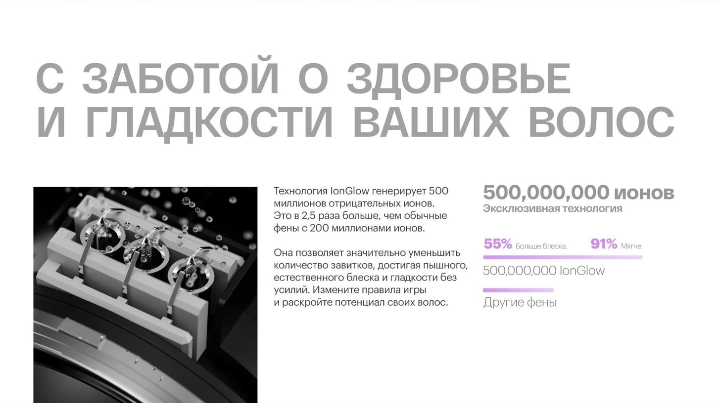 Высокоскоростной фен со скоростью потока 70 м/ с, обеспечивает мгновенную сушку волос всего за 2 минуты, 4 температурных режима и 3 режима скорости помогут подстроиться под любой стиль укладки. Стильный и компактный. Бережно сохраняет волосы с 500 млн. негативных ионов и системой терморегулирования
