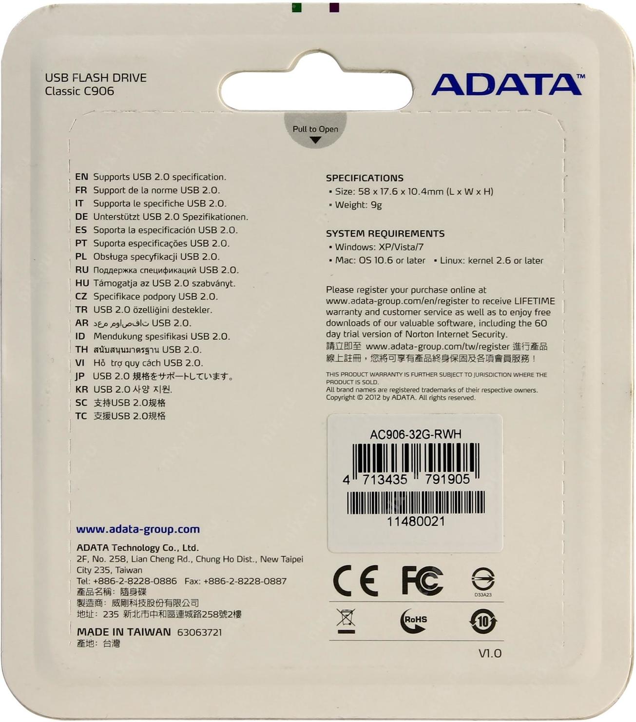 Флеш Диск A-Data 32Gb Classic C906 AC906-32G-RWH USB2.0 белый