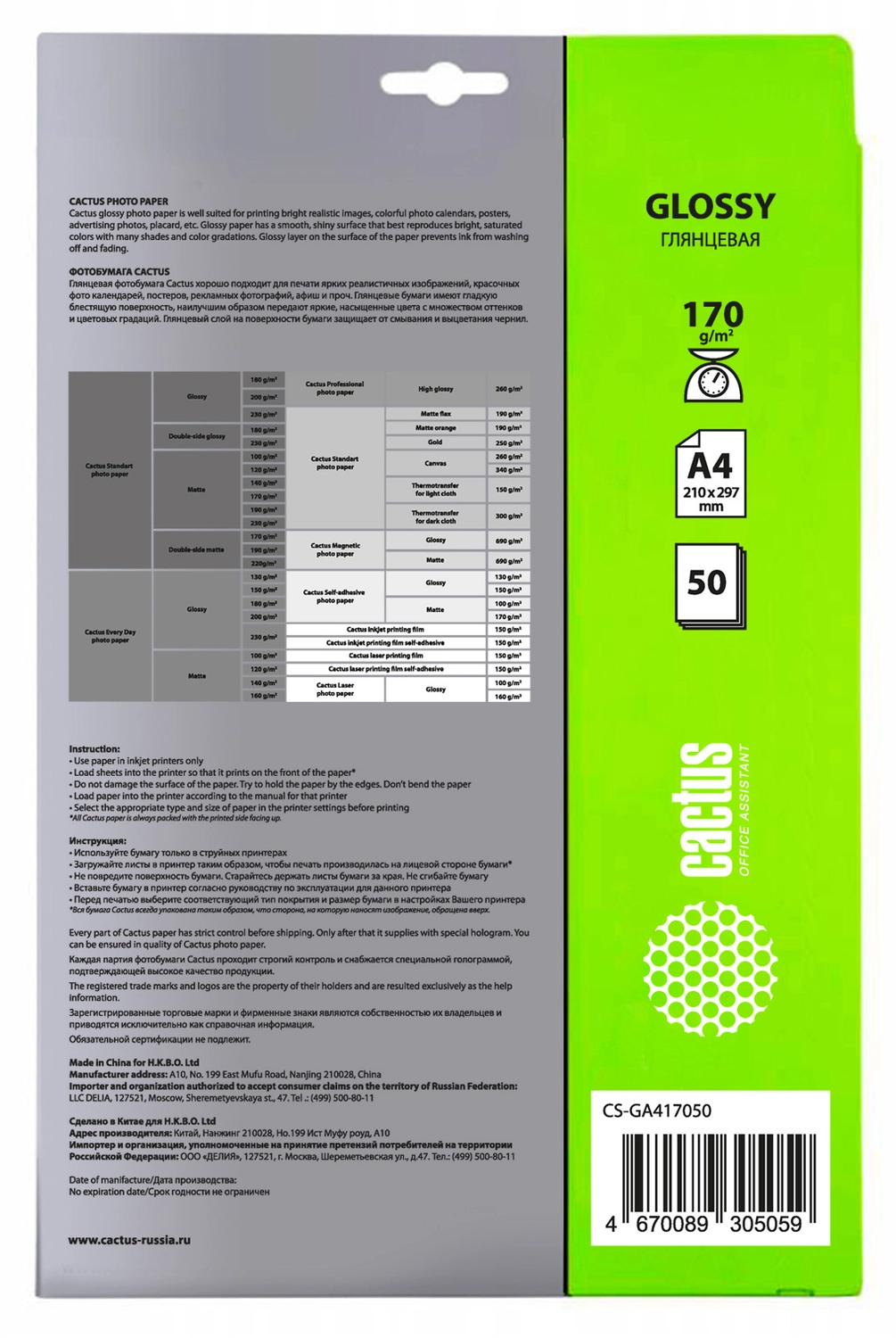 Фотобумага Cactus CS-GA417050 A4/ 170г/ м2/ 50л./ белый глянцевое для струйной печати