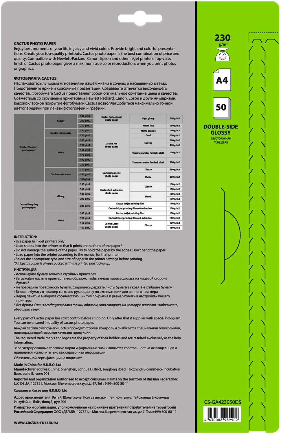 Фотобумага Cactus CS-GA423050DS A4/ 230г/ м2/ 50л./ белый глянцевое/ глянцевое для струйной печати