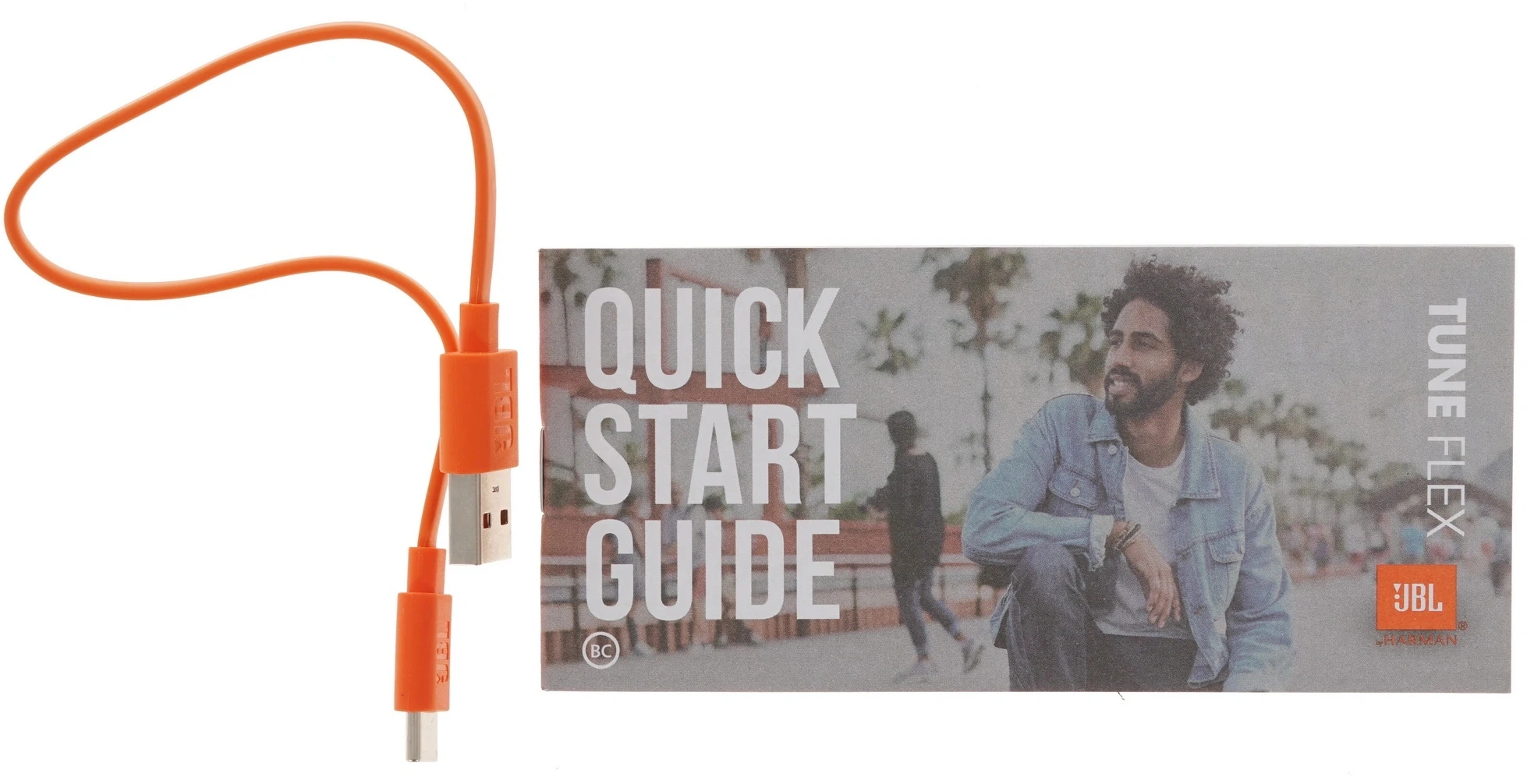 наушники JBL Tune Flex, 2 пары сменных амбушюр, документация, зарядная станция-футляр, кабель для зарядки футляра.