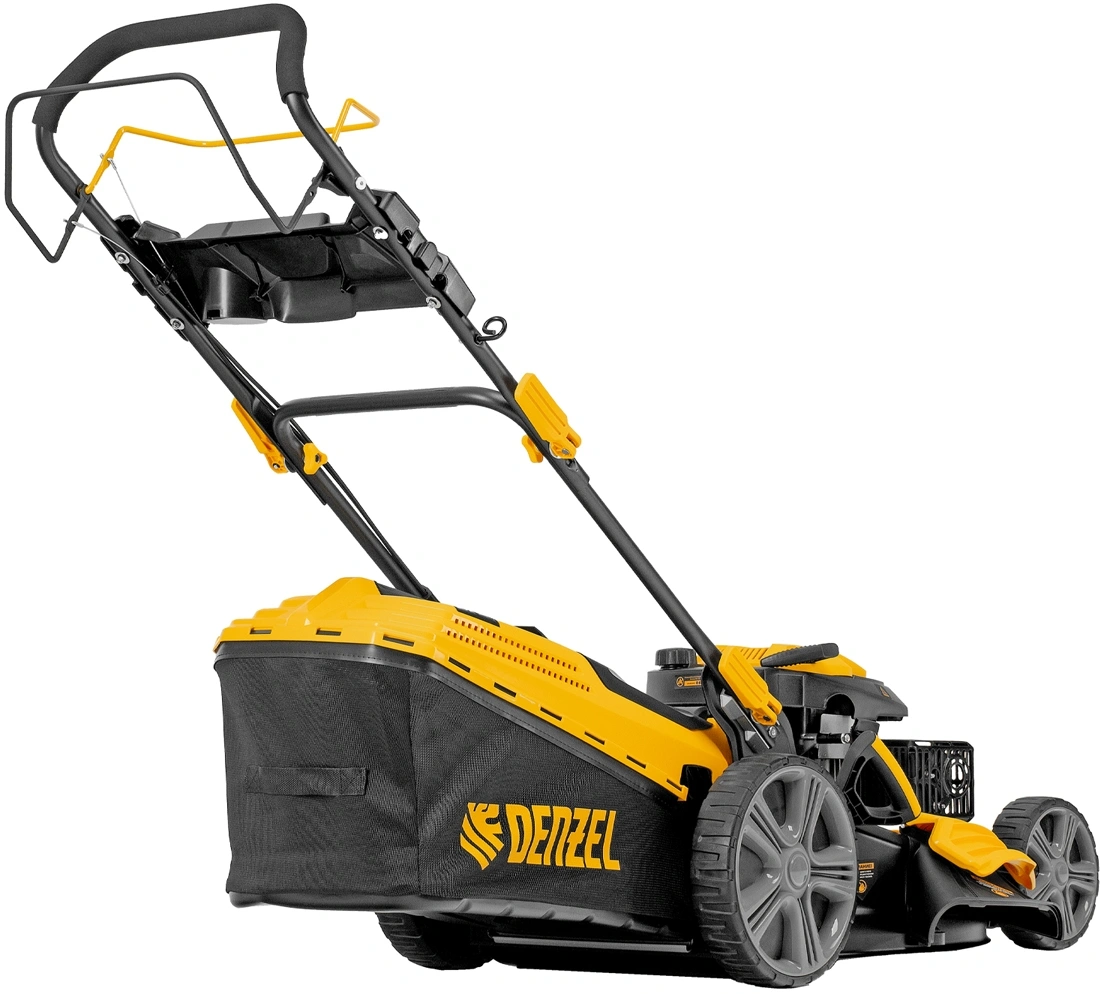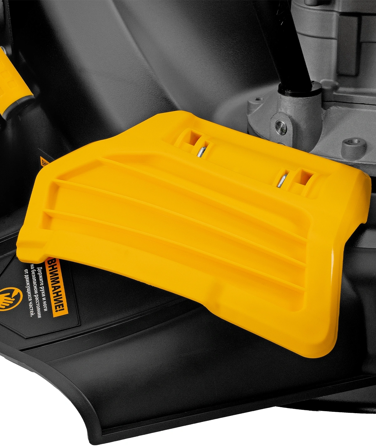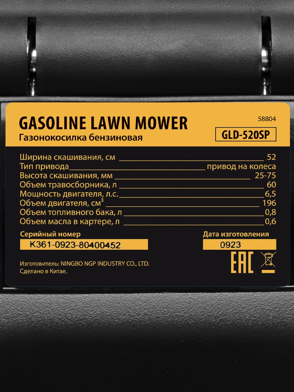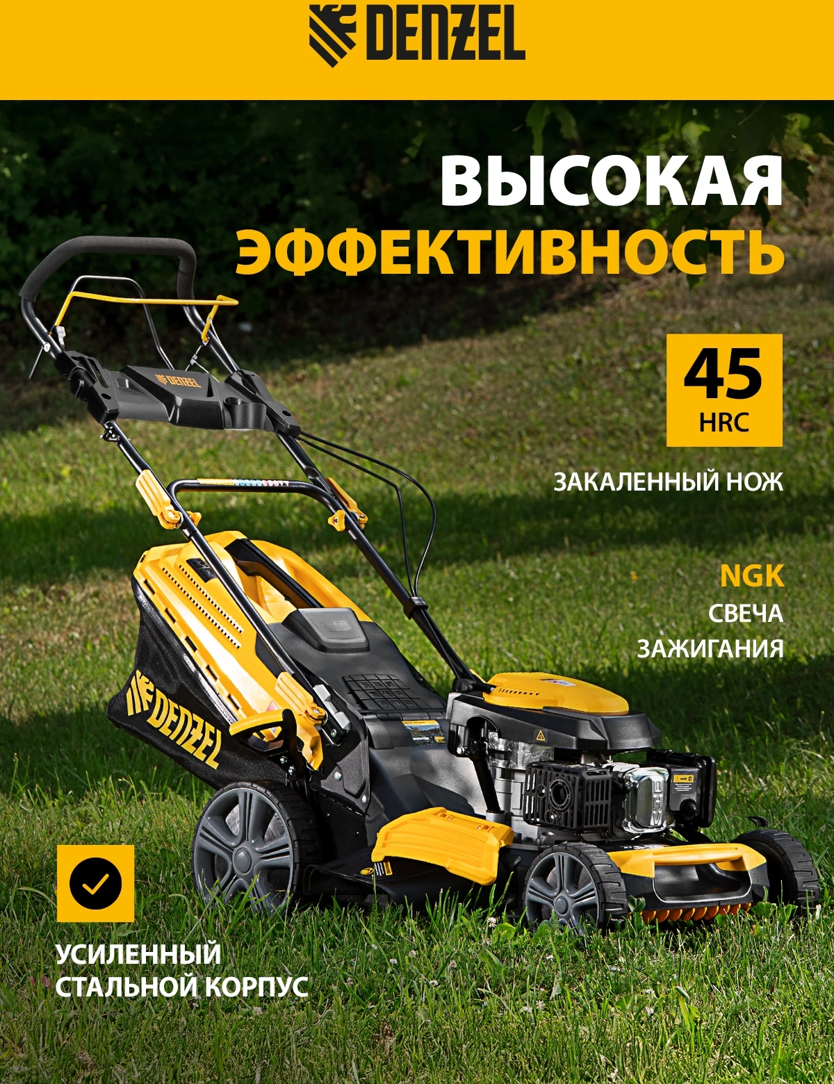 Газонокосилка в сборе с ножом и колесами, травосборник, дефлектор бокового выброса, нижняя часть рукоятки, верхняя часть рукоятки, комплект крепежа, ключ свечной, фиксатор троса, заглушка для мульчирования, руководство по эксплуатации с гарантийным талоном.