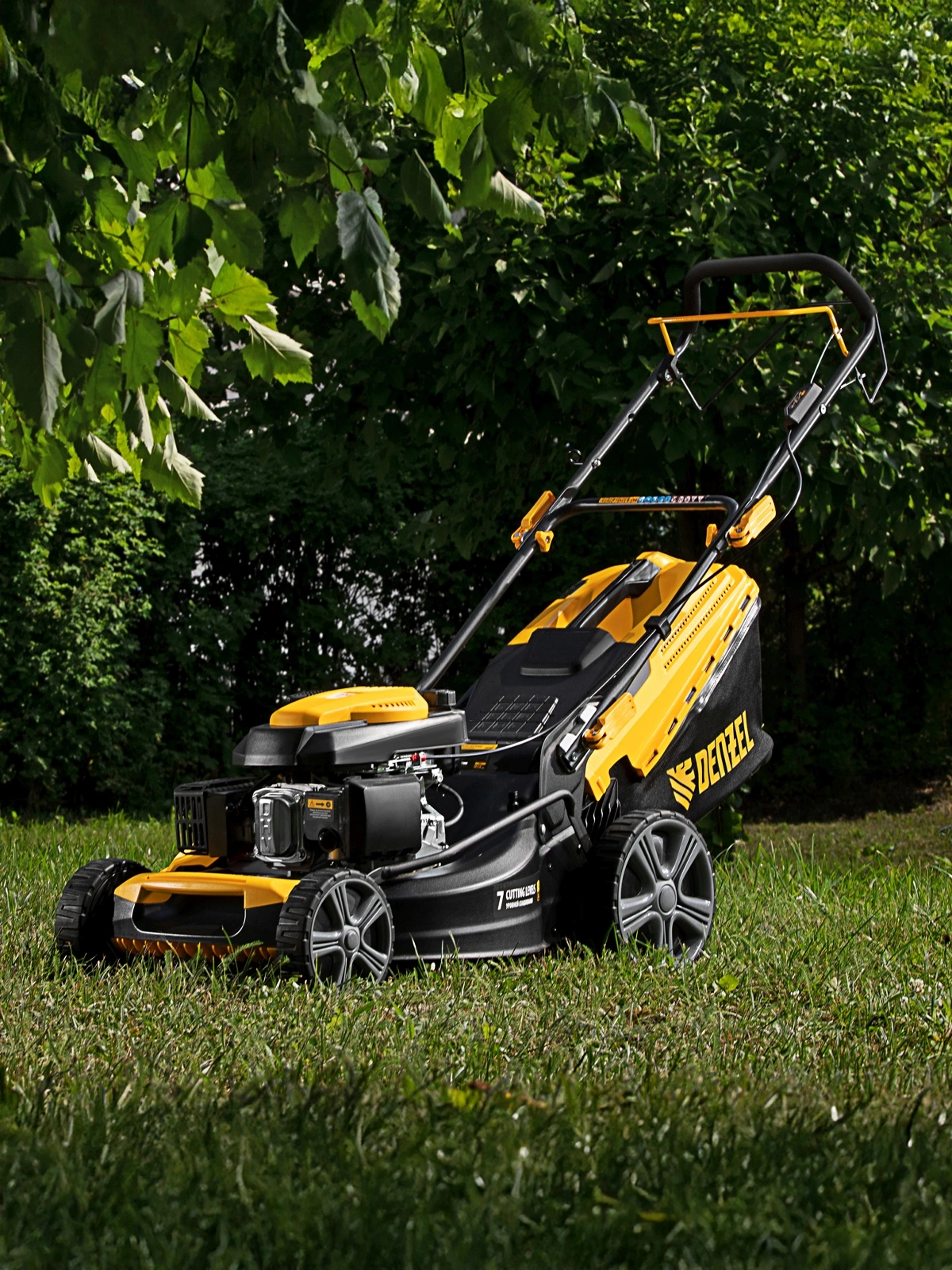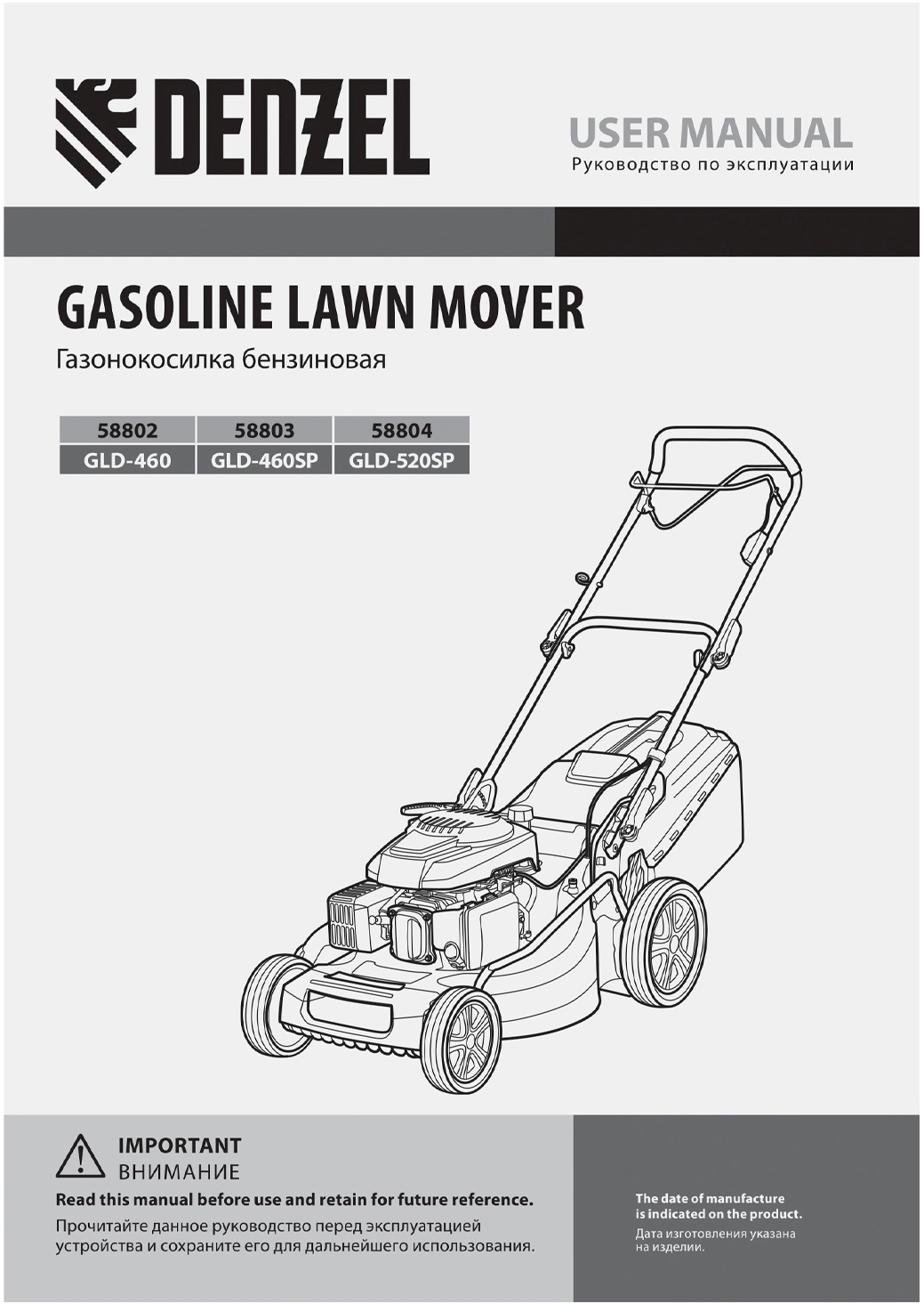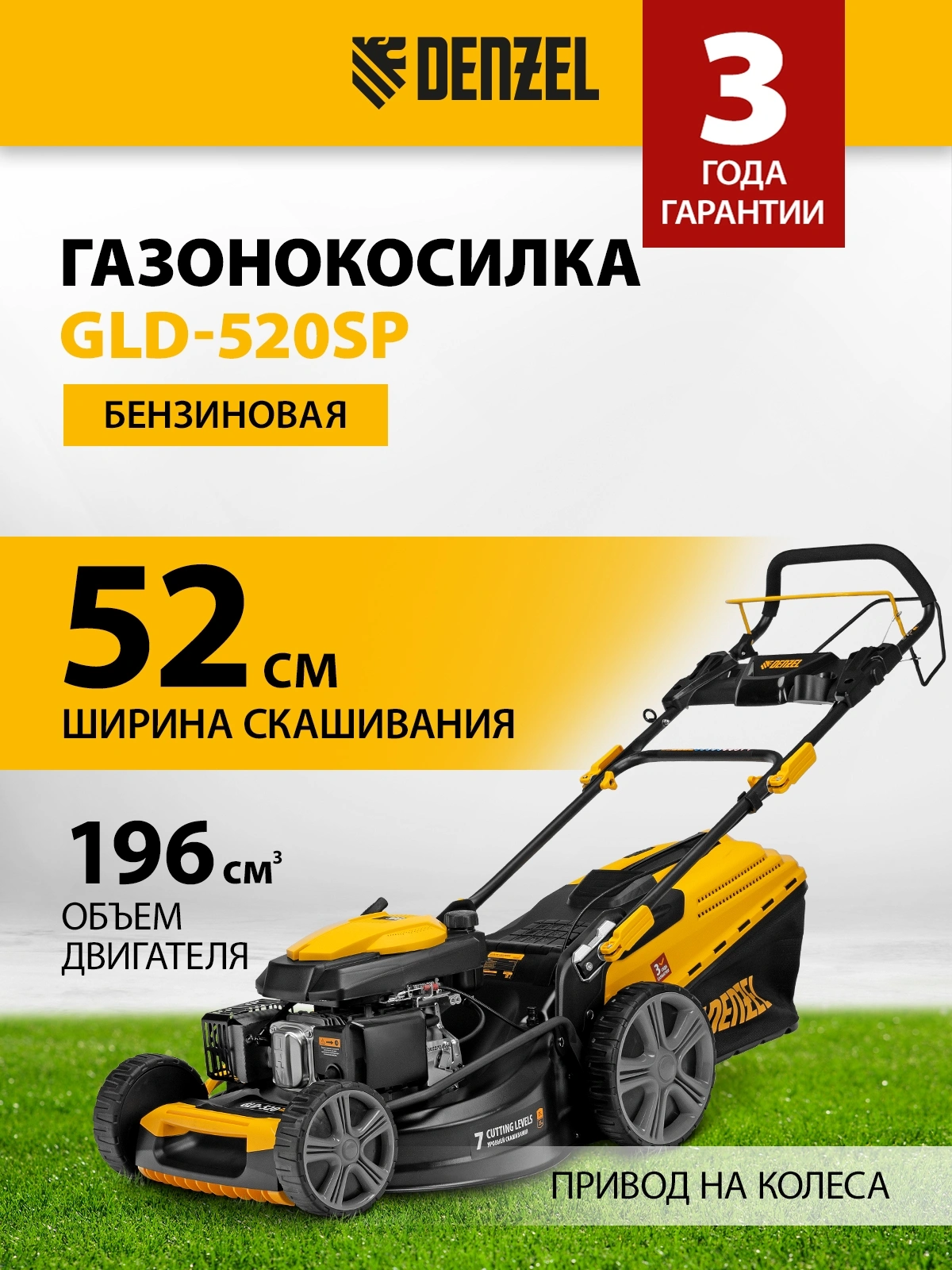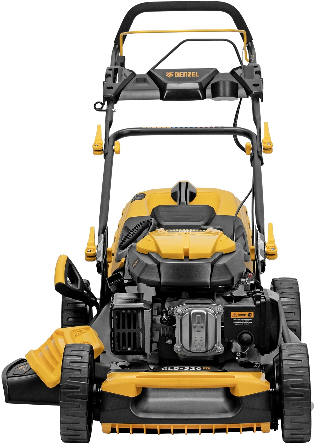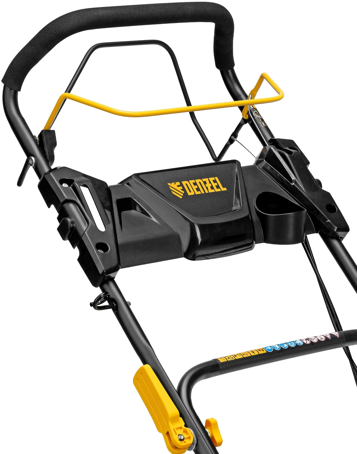 Газонокосилка в сборе с ножом и колесами, травосборник, дефлектор бокового выброса, нижняя часть рукоятки, верхняя часть рукоятки, комплект крепежа, ключ свечной, фиксатор троса, заглушка для мульчирования, руководство по эксплуатации с гарантийным талоном.