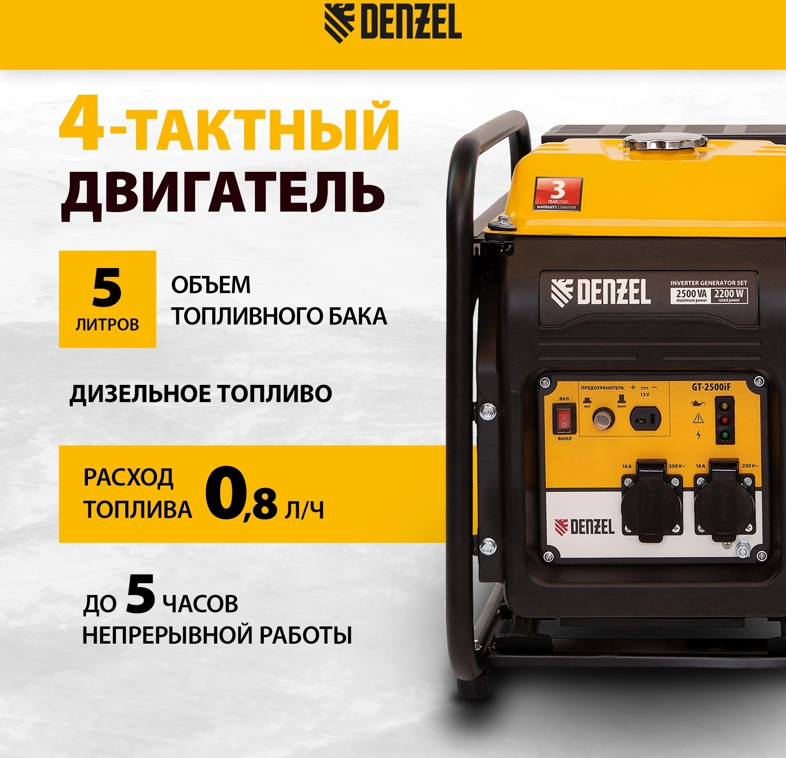 Легкий, компактный и экономичный инверторный генератор Denzel GT-2500iF для дачи, мастерской и выезда на природу. Главное его преимущество - это высокое качество тока, поэтому он часто используется для чувствительной электроники и приборов, восприимчивых к перепадам напряжения.