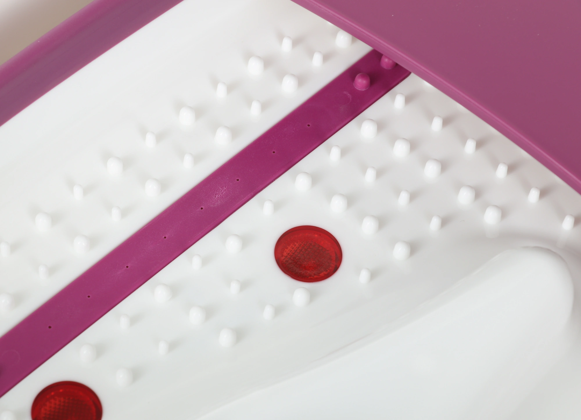 Расслабляющие инфракрасные световые точки. Невероятная компактность - складная гидромассажная ванна для ног. 3 функции: поддержание равномерной температуры воды, вибромассаж и гидромассаж. Насадка для педикюра в комплекте (пемза) .