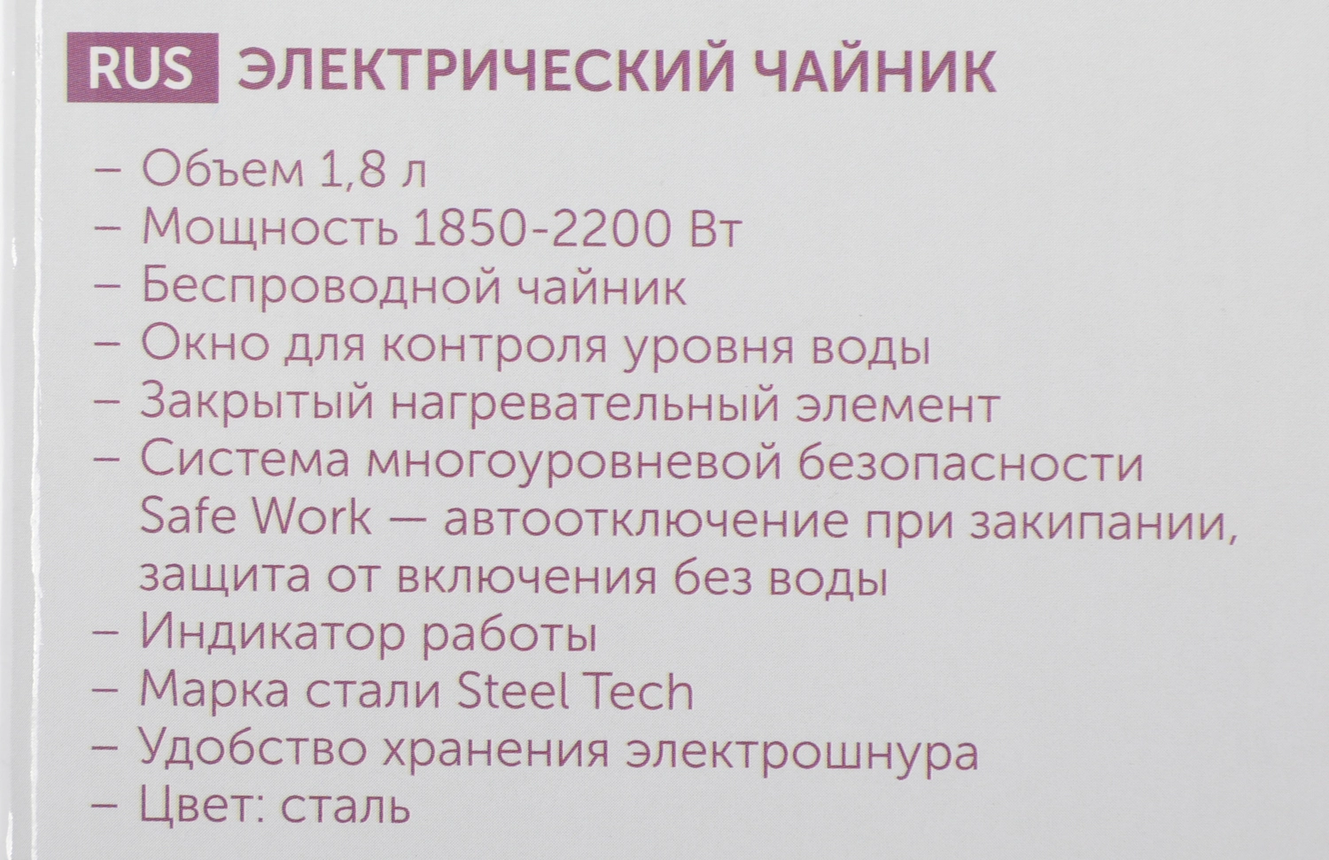 Safe Work ? автоотключение при закипании, защита от включения без воды сделает эксплуатацию прибора наиболее безопасной.