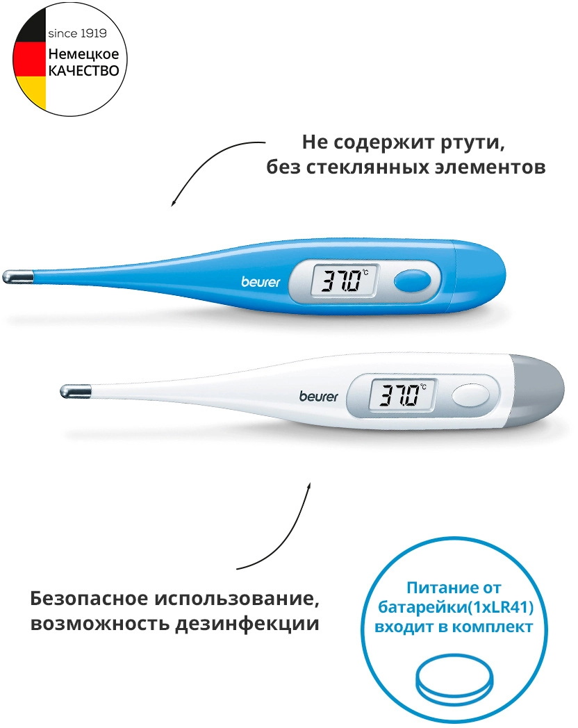 Медицинский термометр для контактного измерения температуры прост в применении и имеет водонепроницаемый корпус. Не содержит ртуть, без стекла. Индикация последнего результата измерения