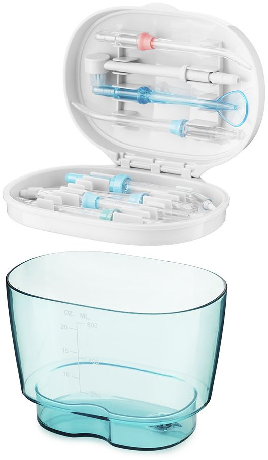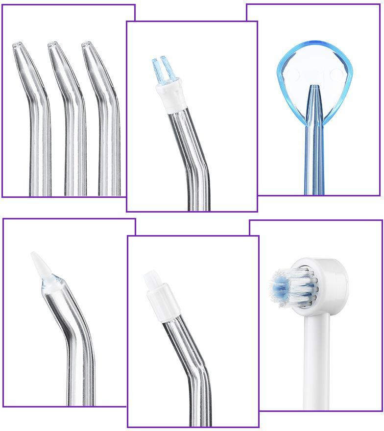 В комплекте идут различные насадки: классические струйные, для ортодонтических конструкций, насадка для чистки языка, насадка для удаления зубного камня и налёта из-под линии десны, насадка с щёточкой для удаления налёта и вращающаяся зубная щётка.