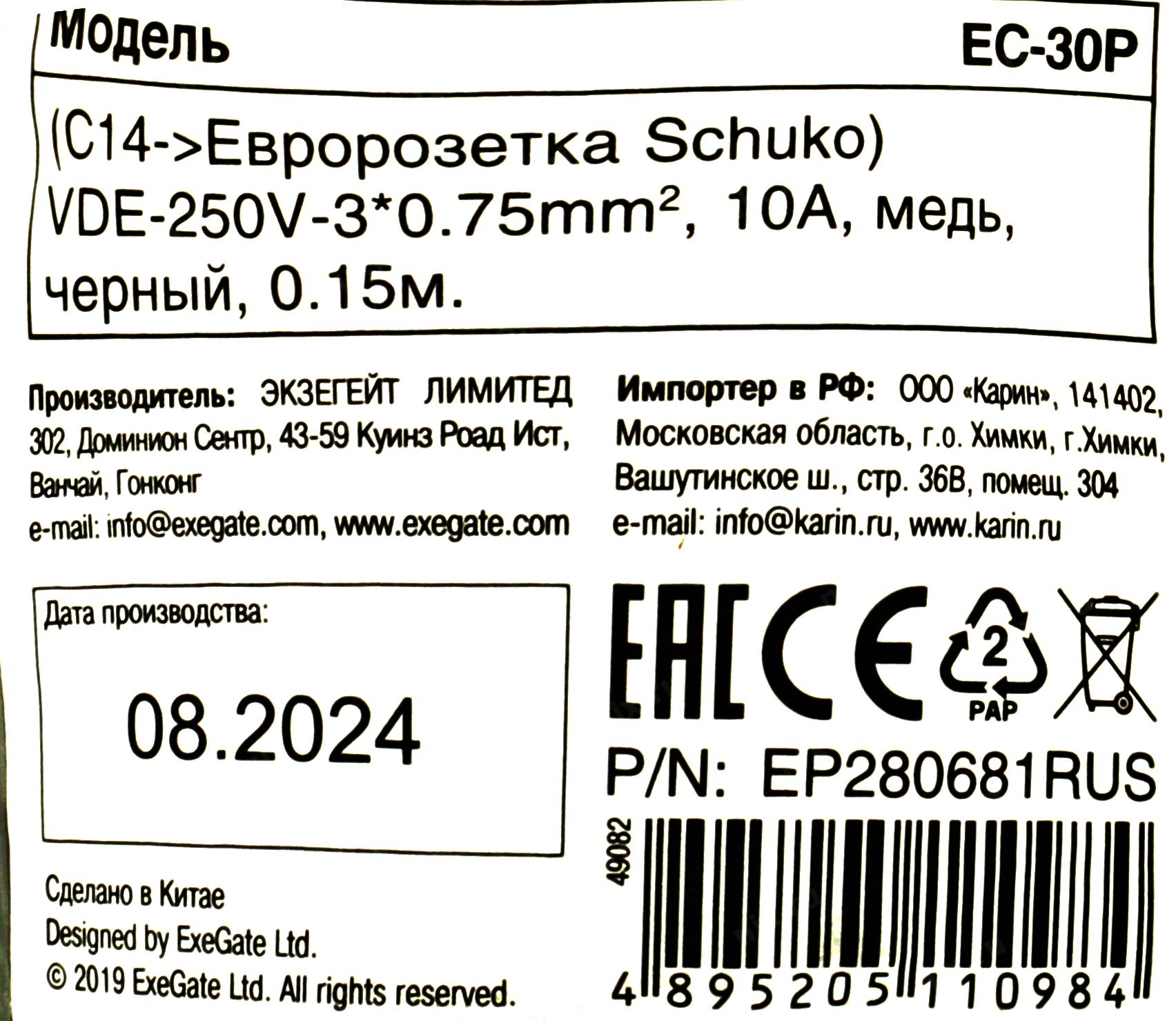 Кабель ExeGate EC-30P < EP280681RUS> Кабель IEC-320-C14 - Евророзетка Schuko 0.15м