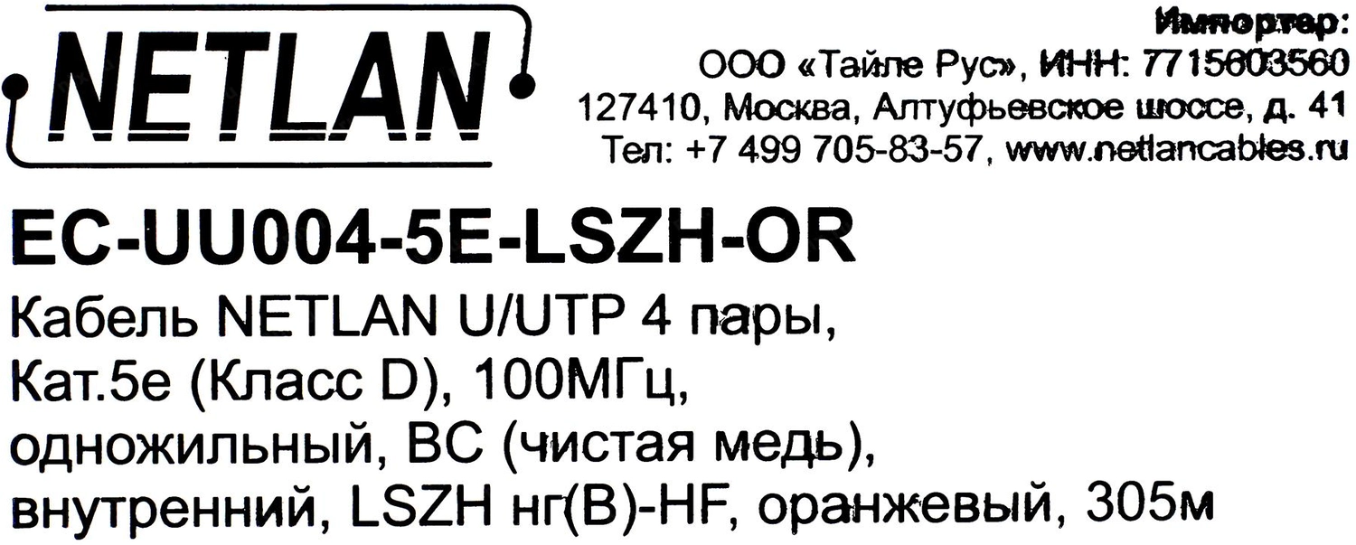 Кабель UTP 4 пары кат.5e < бухта 305м> NETLAN < EC-UU004-5E-LSZH-OR>