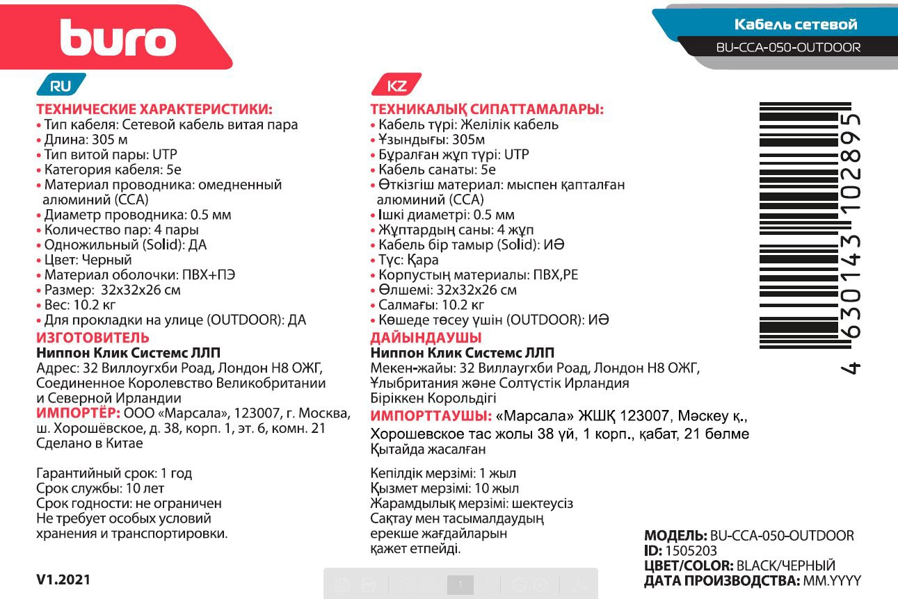 Кабель сетевой Buro BU-CCA-050-OUTDOOR UTP 4 пары cat.5E solid 0.50мм CCA 305м черный outdoor