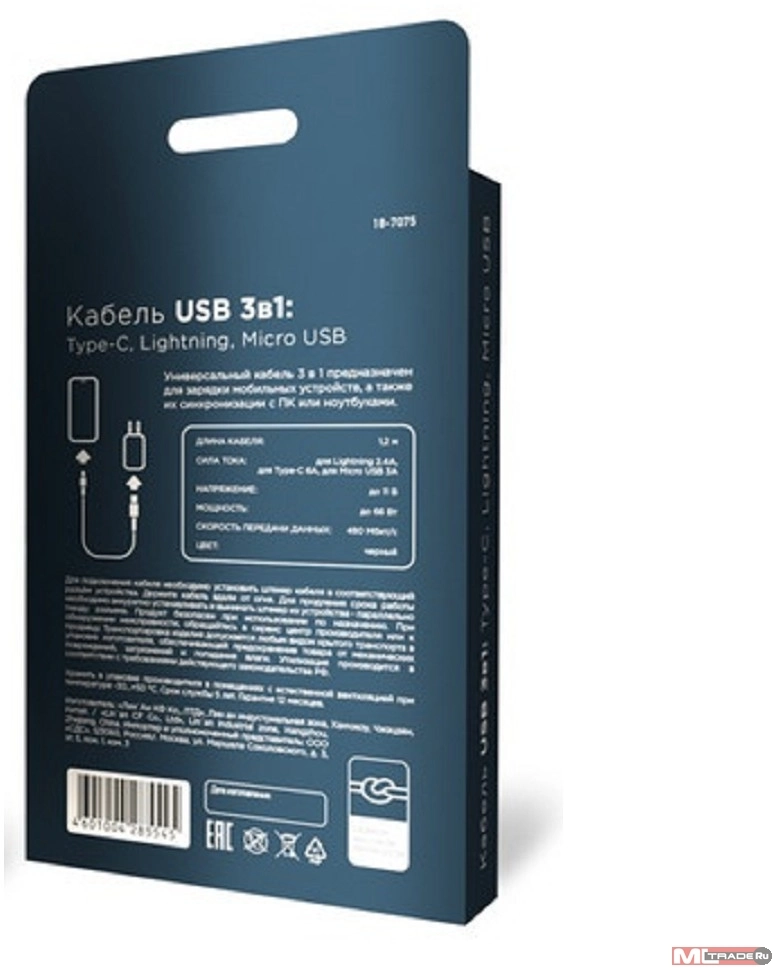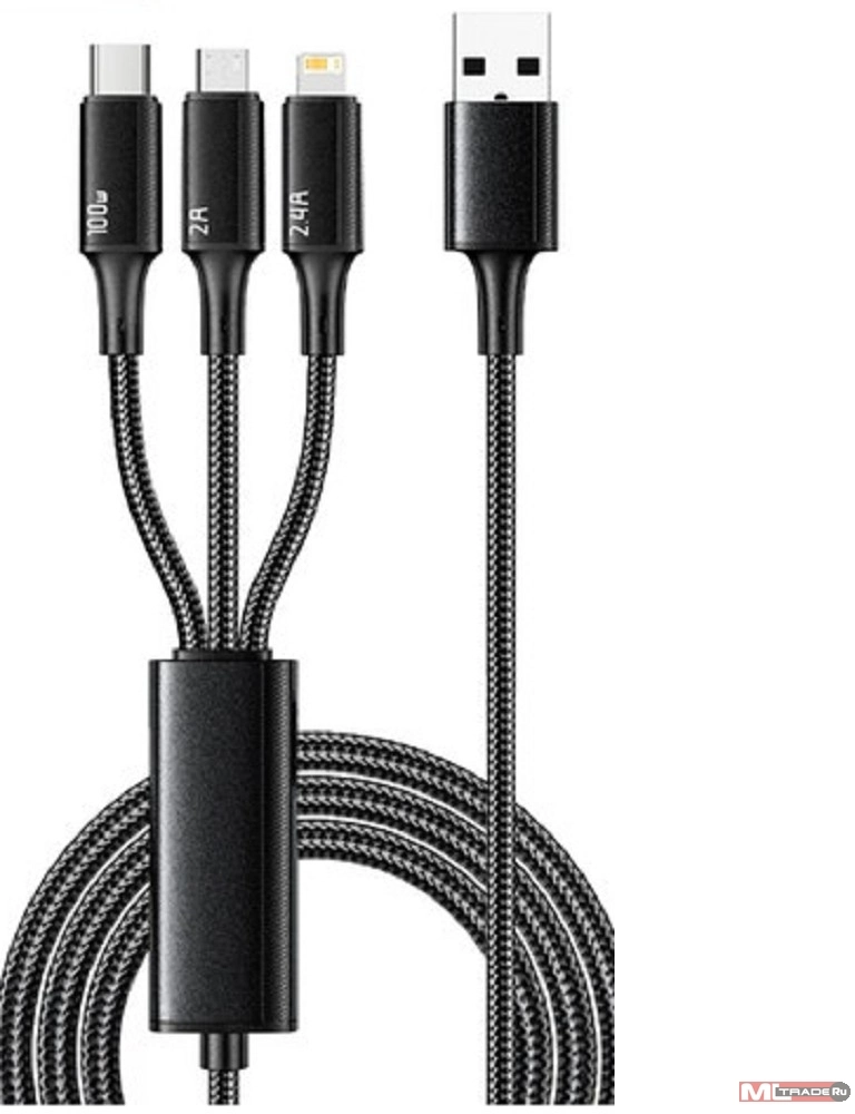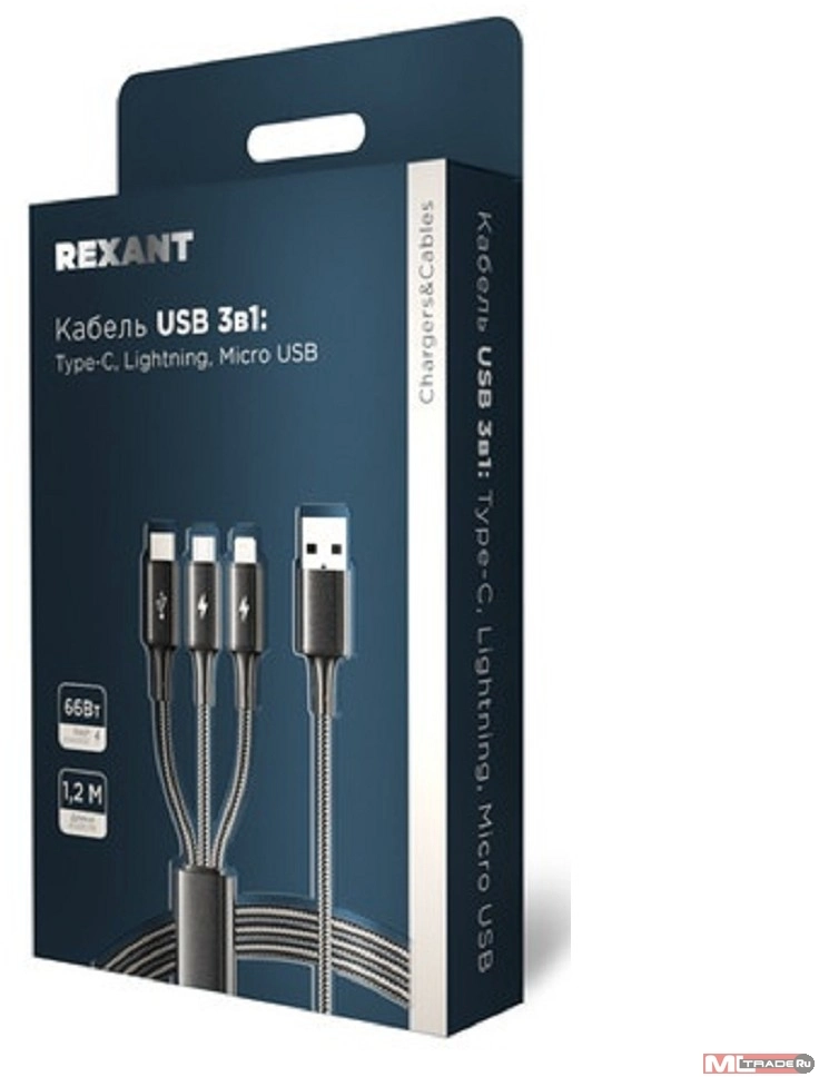 Кабели Rexant (18-7075) Кабель USB 3в1 Type-С (6A), Lightning (2,4A), micro USB (3A) 1,2м, в черной оплетке