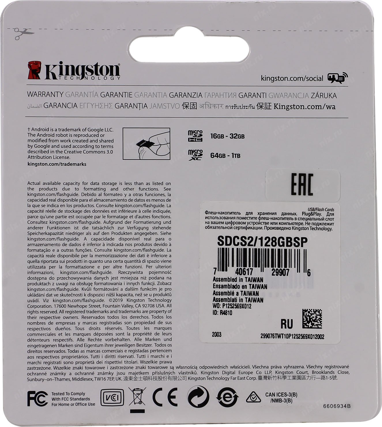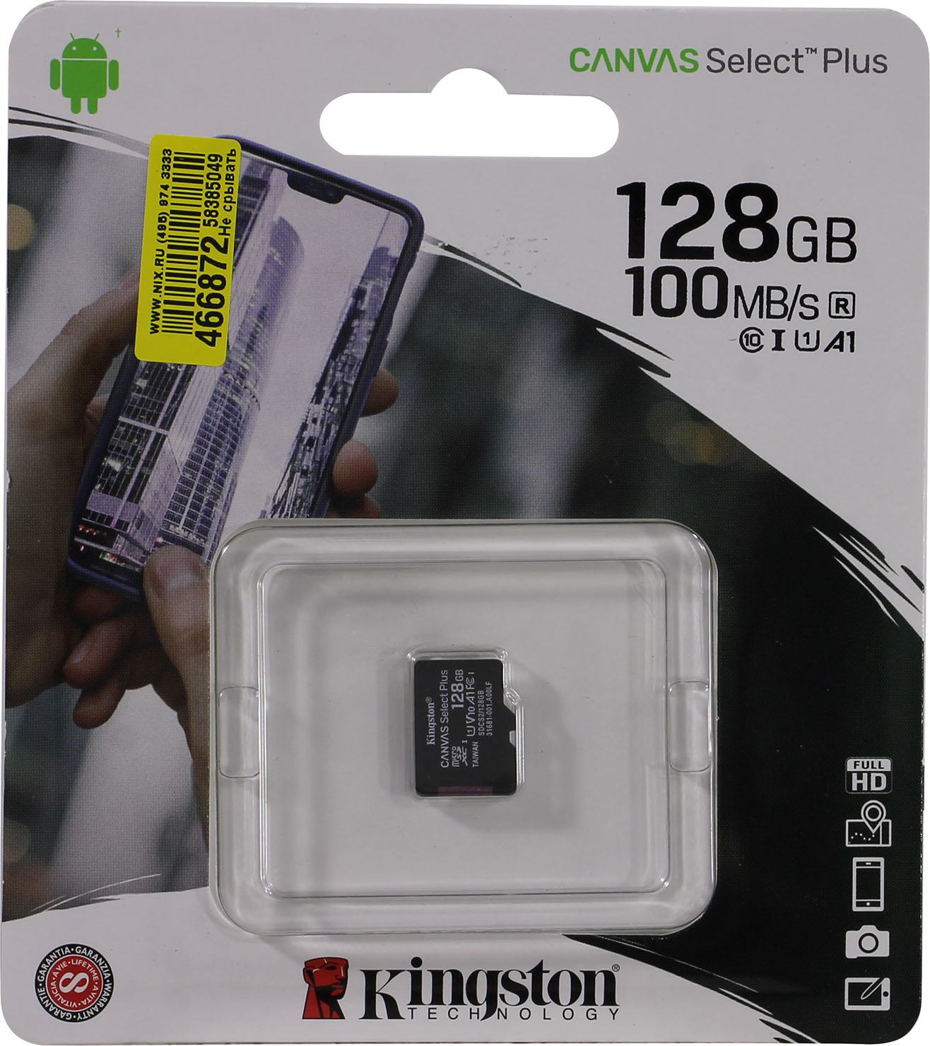 Карта памяти Micro SecureDigital 128Gb Kingston SDCS2/ 128GBSP (MicroSDXC Class 10 UHS-I)