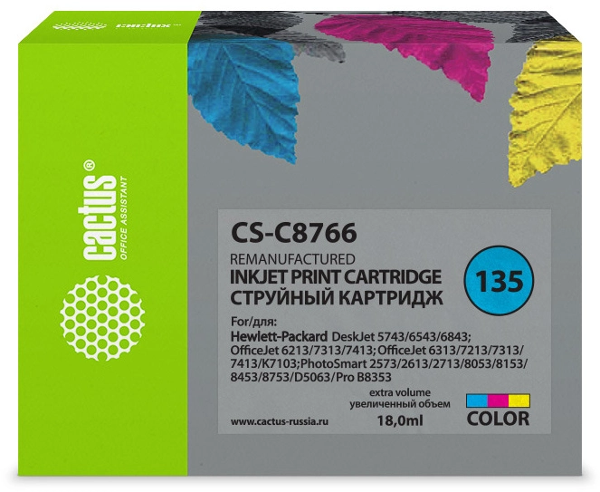 Картридж струйный Cactus CS-C8766 №135 многоцветный (18мл) для HP DJ 5743/ 6543/ 6843/ DJ 6213/ 7313/ 7413/ 6313/ 7213/ 7313/ 7413/ K7103/ PS 2573/ 2613/ 2713/ 8053/ 8153/ 8453/ 8753/ D5063/ Pro B8353 с чипом