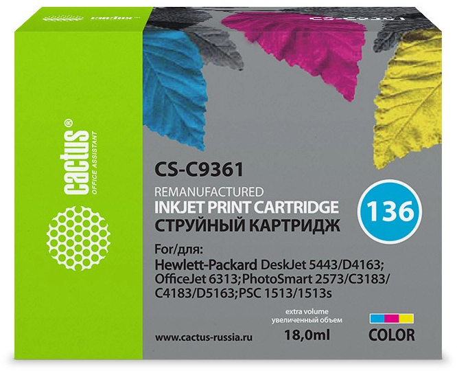 Картридж струйный Cactus CS-C9361 №136 многоцветный (18мл) для HP DJ 5443/ D4163/ DJ 6313/ PS 2573/ C3183/ C4183/ D5163/ 1513/ 1513s с чипом