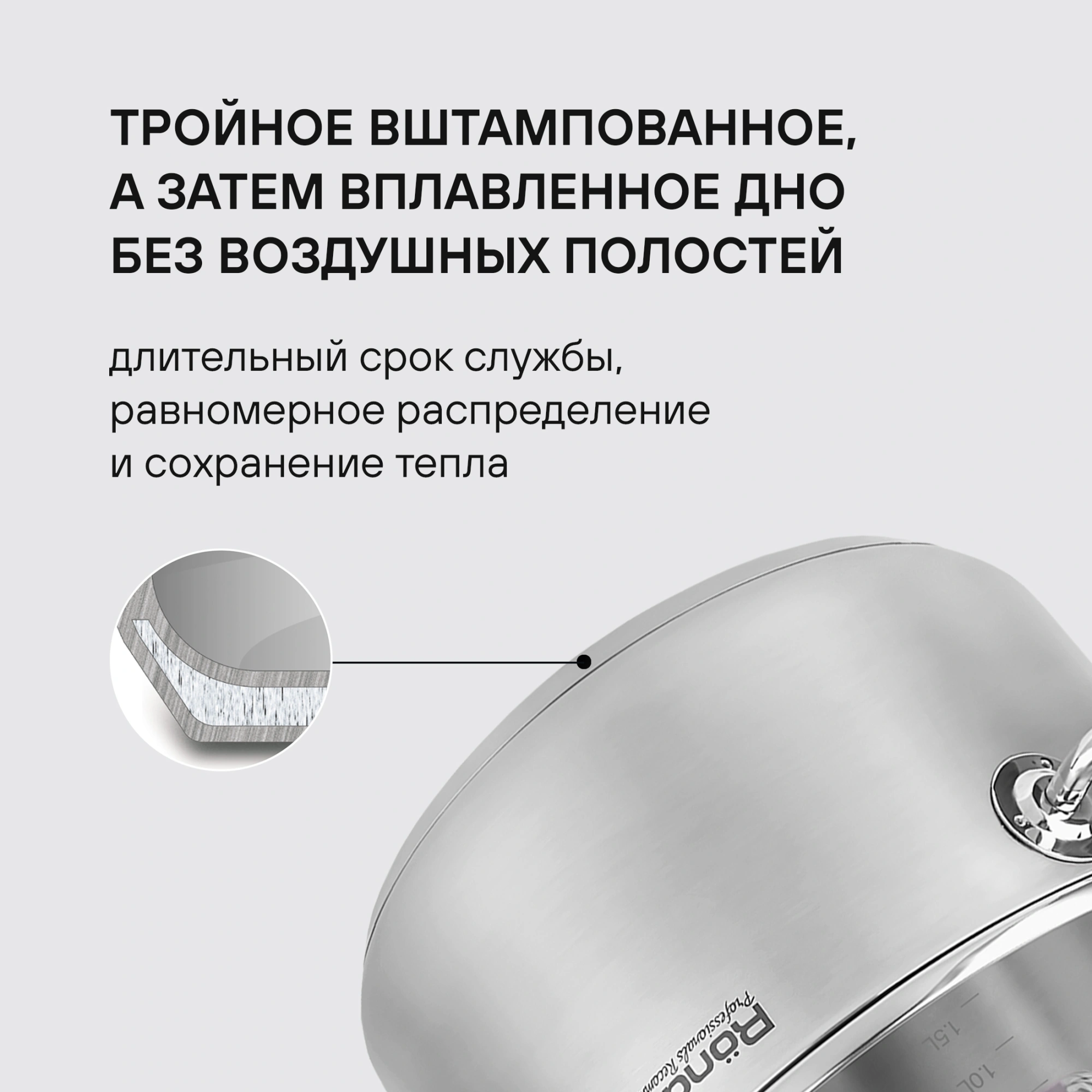 Материал: высококачественная нержавеющая сталь 18/ 10. Технология: тройное вштампованное, а затем вплавленное дно без воздушных полостей. Материал крышки: термостойкое стекло. Аксессуары: удобные комбинированные: нержавеющая сталь и силикон. Преимущества: эргономичная форма ручек.