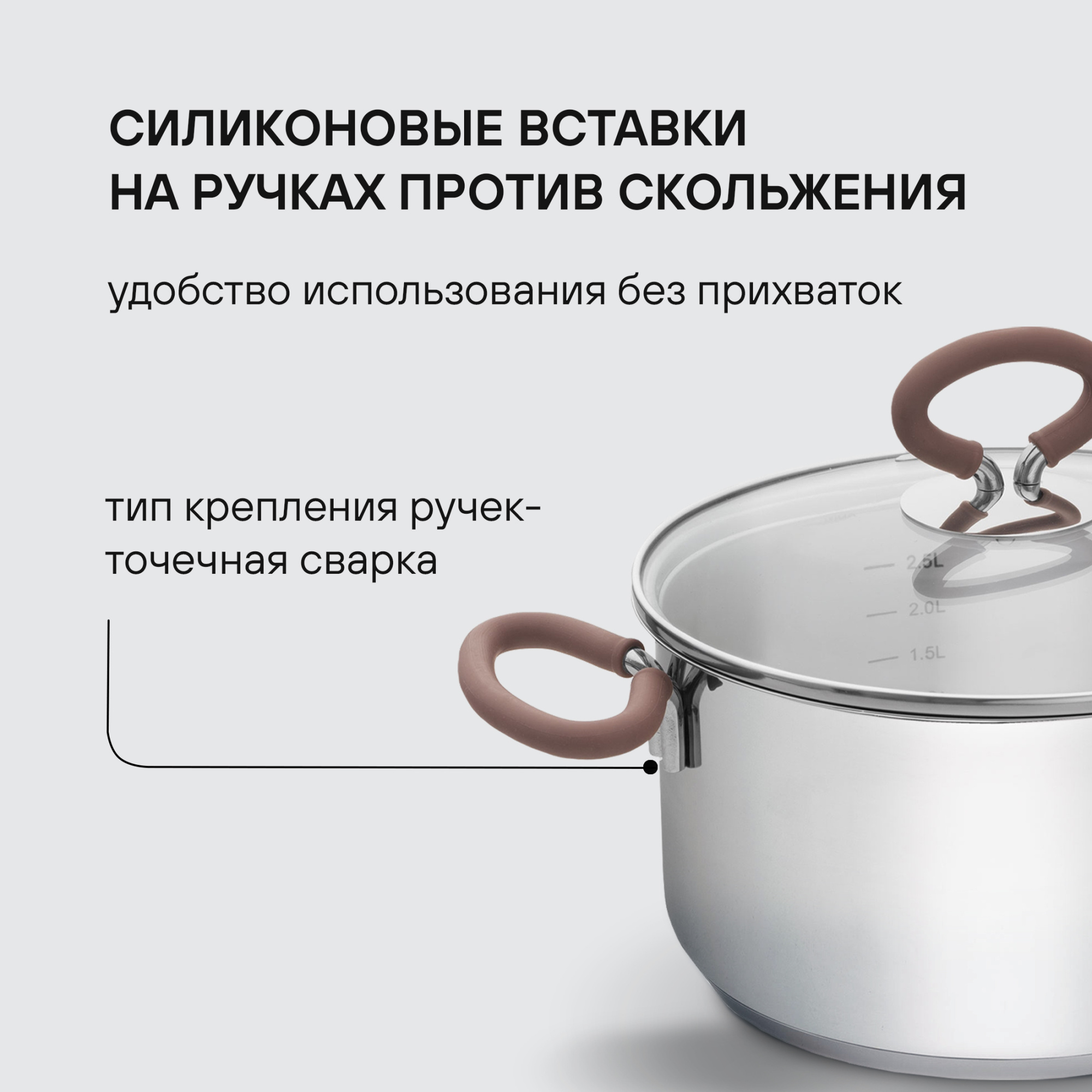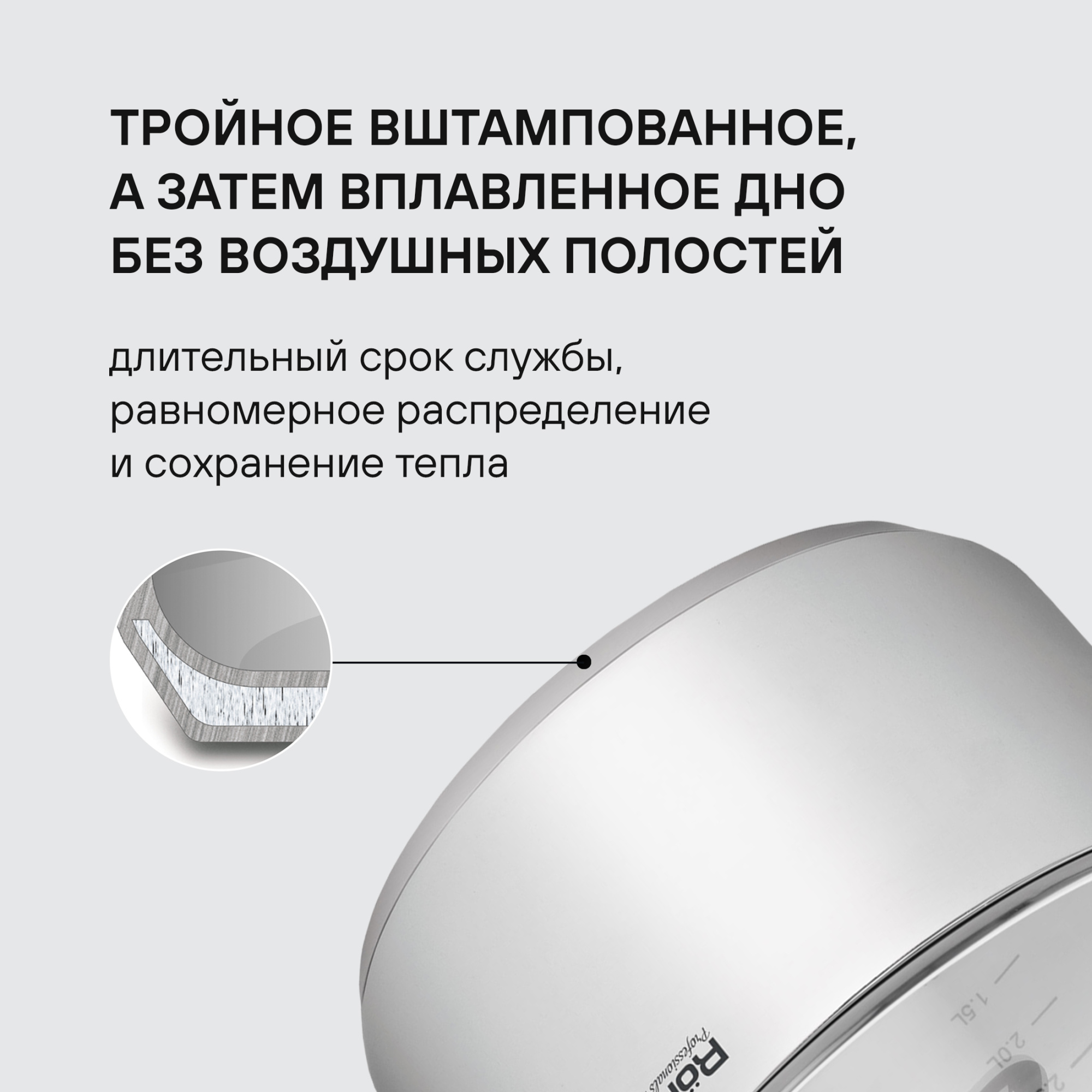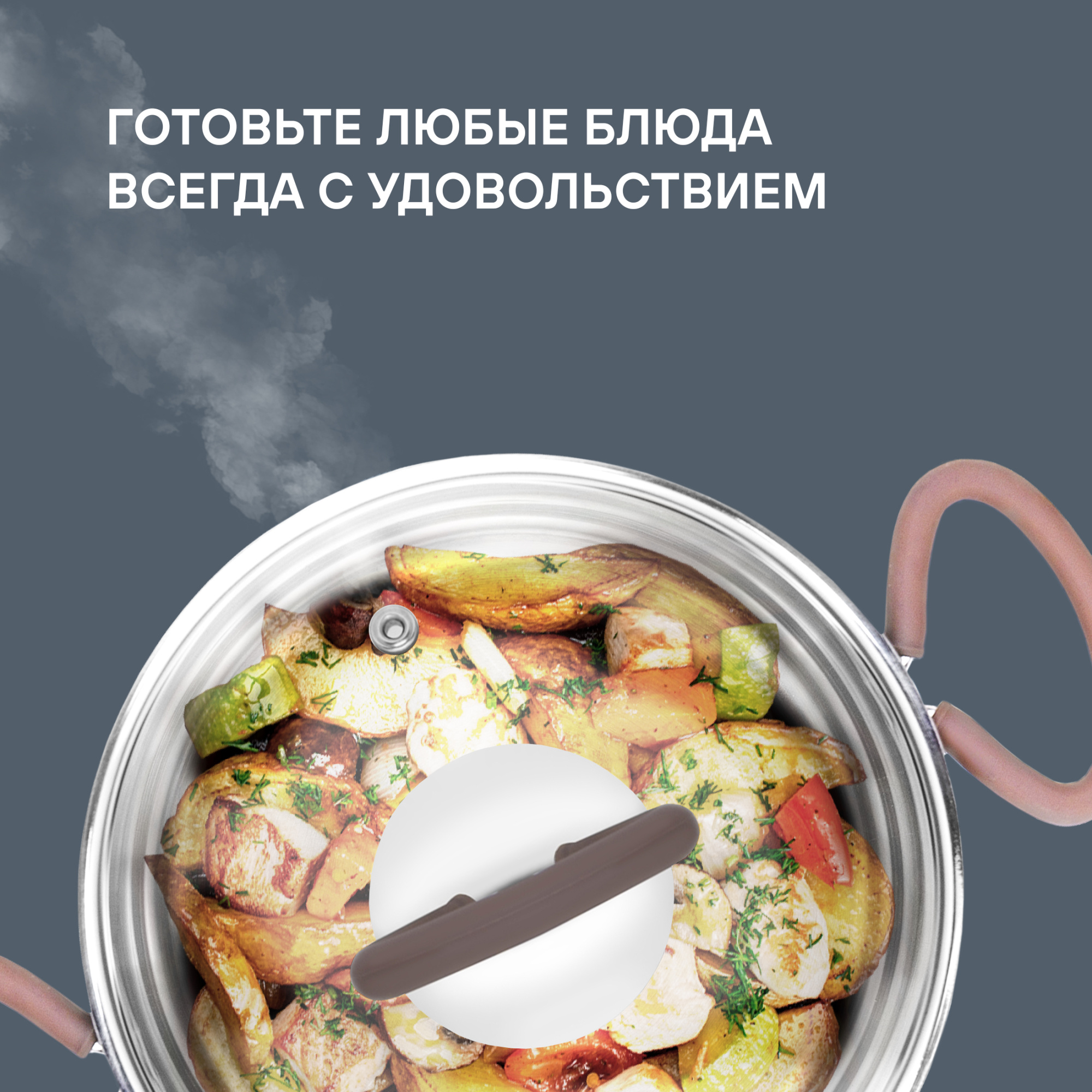 Технология: тройное вштампованное, а затем вплавленное дно без воздушных полостей. Материал крышки: термостойкое стекло. Аксессуары: удобные комбинированные: нержавеющая сталь и силикон. Преимущества: эргономичная форма ручек; Удобный хват; Силиконовые вставки на ручках против скольжения.