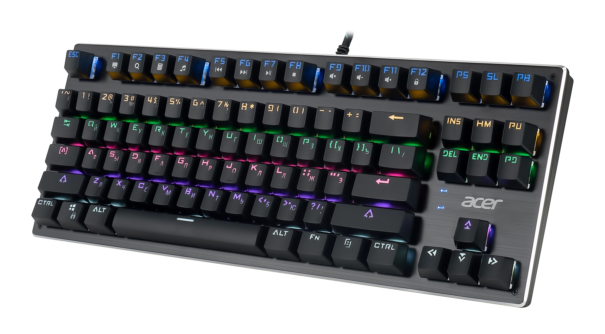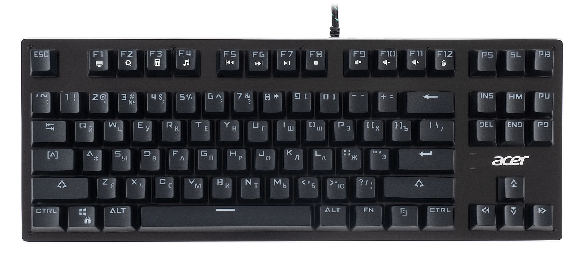 Компактная механическая клавиатура без цифрового блока. Занимает меньше места. Прорезиненные ножки, Жесткая металлическая пластина, длинный кабель, регулируемая подсветка. Поддержка мультимедийных функций. Универсальный инструмент для работы и игр.Функция регулировки яркости подсветки.