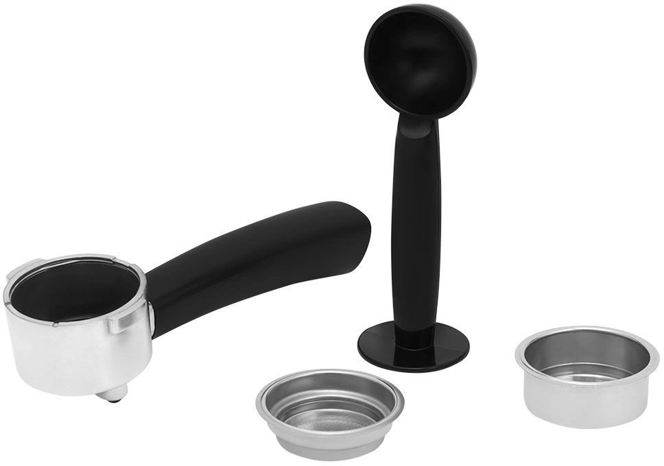 В комплекте к кофеварке идёт ложка-темпер. Темпер используется для утрамбовки молотого кофе и как мерная ложка. Металлический фильтр у рожка идёт с лазерным нанесением отверстий. Он долговечен и не требует использования каких-либо расходующихся частей.