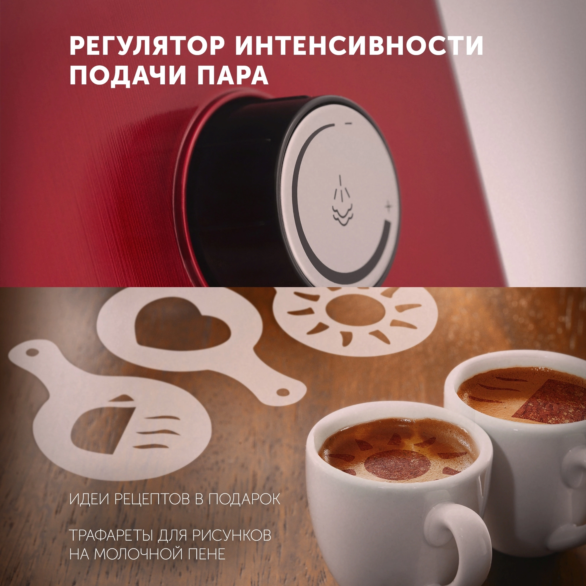 Разнообразные рецепты кофейно-молочных напитков представлены в книге «Идеи для кофе», которая идет в подарок с кофеваркой. А сделать напиток в чашке необычным можно с помощью трафаретов для украшения.