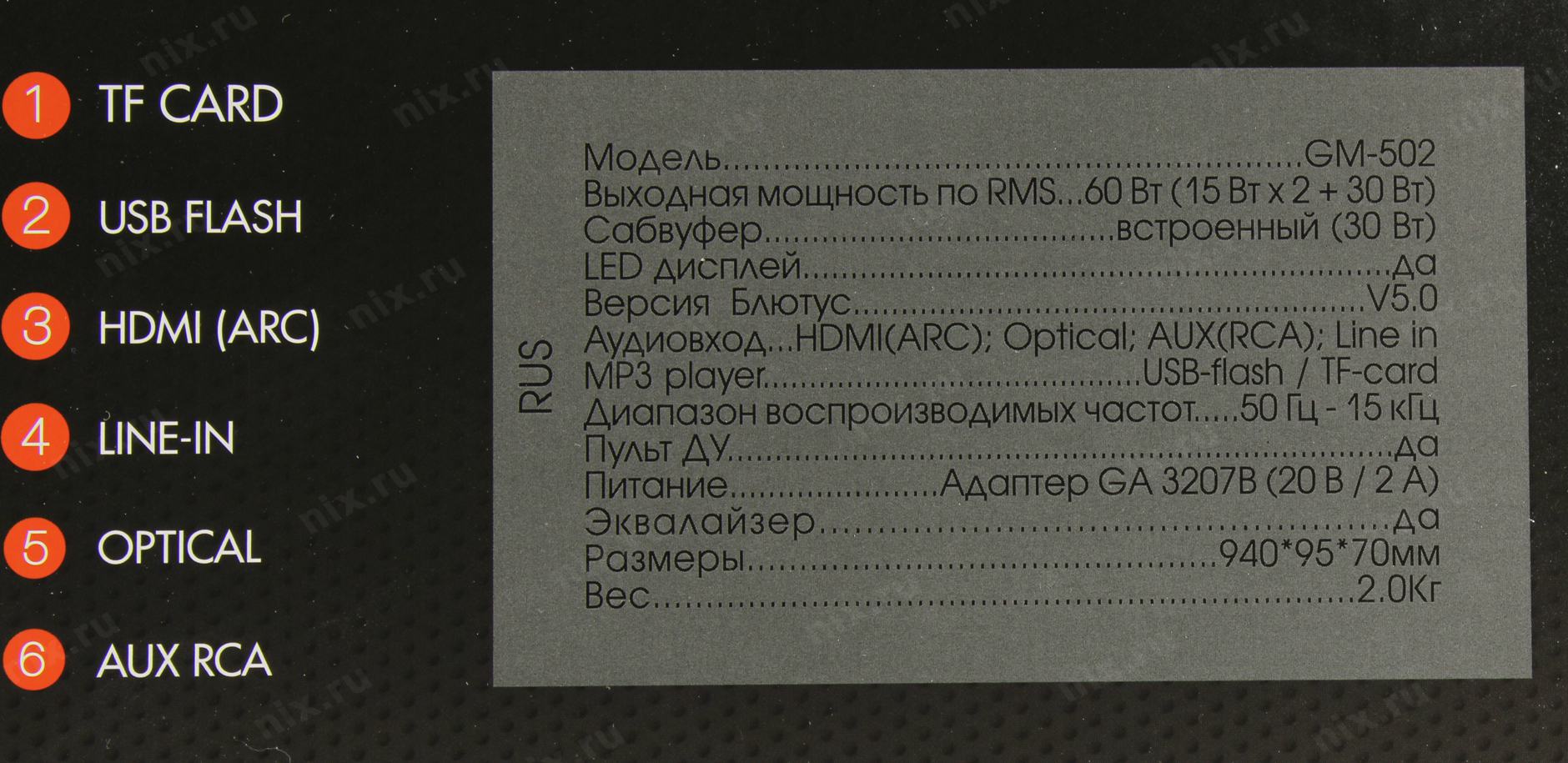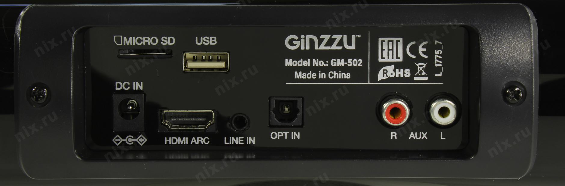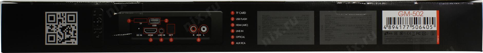 Колонки Ginzzu Ginzzu GM-502, Саундбар, 2x15W+30W/ HDMI/ RCA/ Optical/ BT/ USB/ ДУ