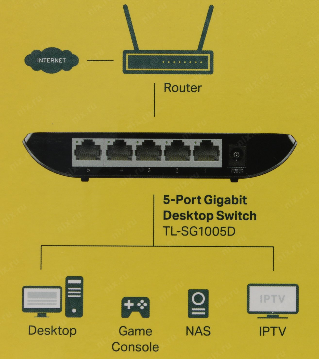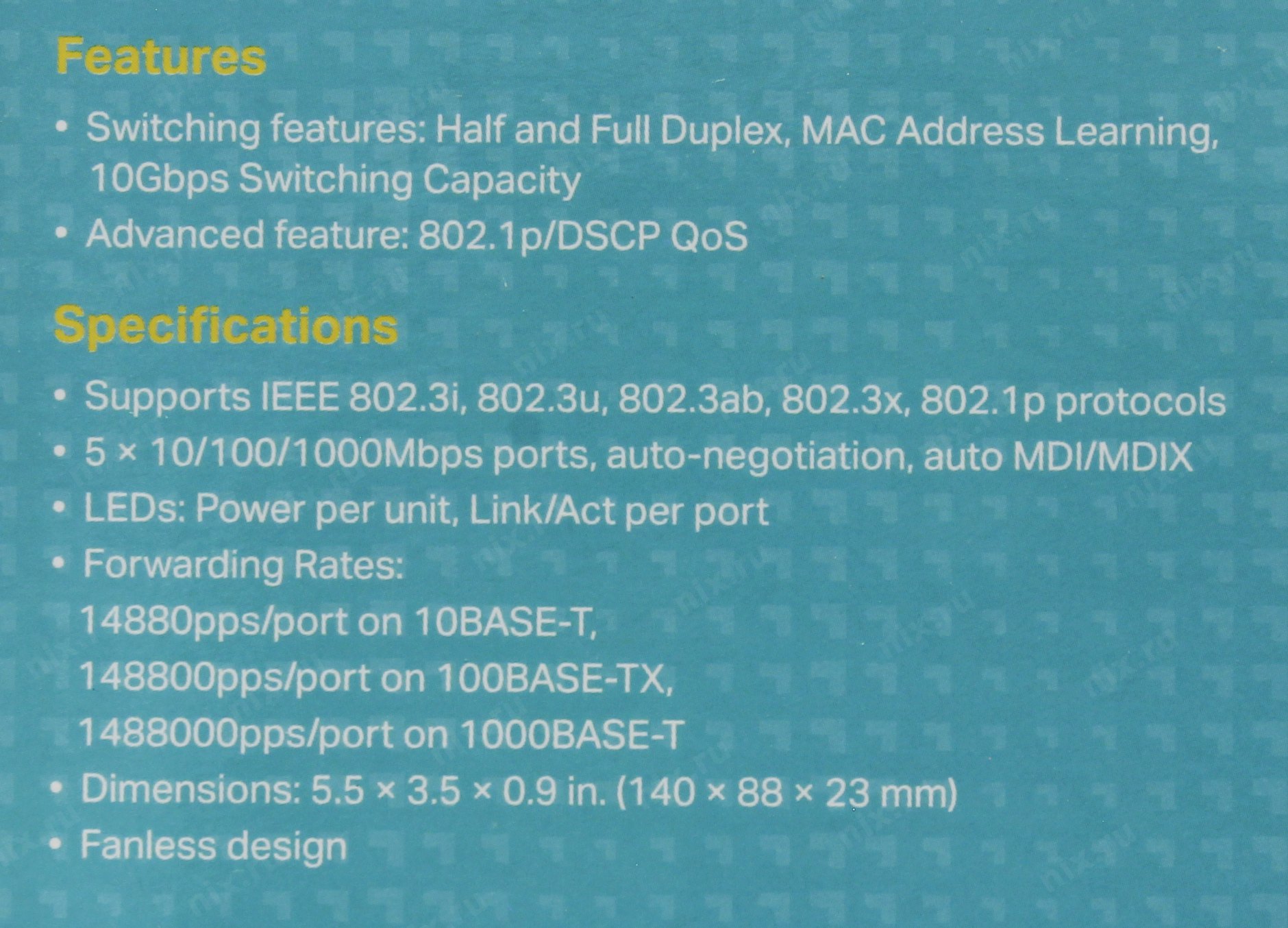 Коммутатор оснащен пятью портами RJ-45 с автоматическим определением скорости (10/ 100/ 1000 Мбит/ сек) , что делает его универсальным решением для любых сетевых устройств. Он соответствует стандартам IEEE 802.3, IEEE 802.3u и IEEE 802.3x, а также поддерживает технологию контроля обратного потока (Back Pressure) для предотвращения перегрузок в полудуплексном режиме.