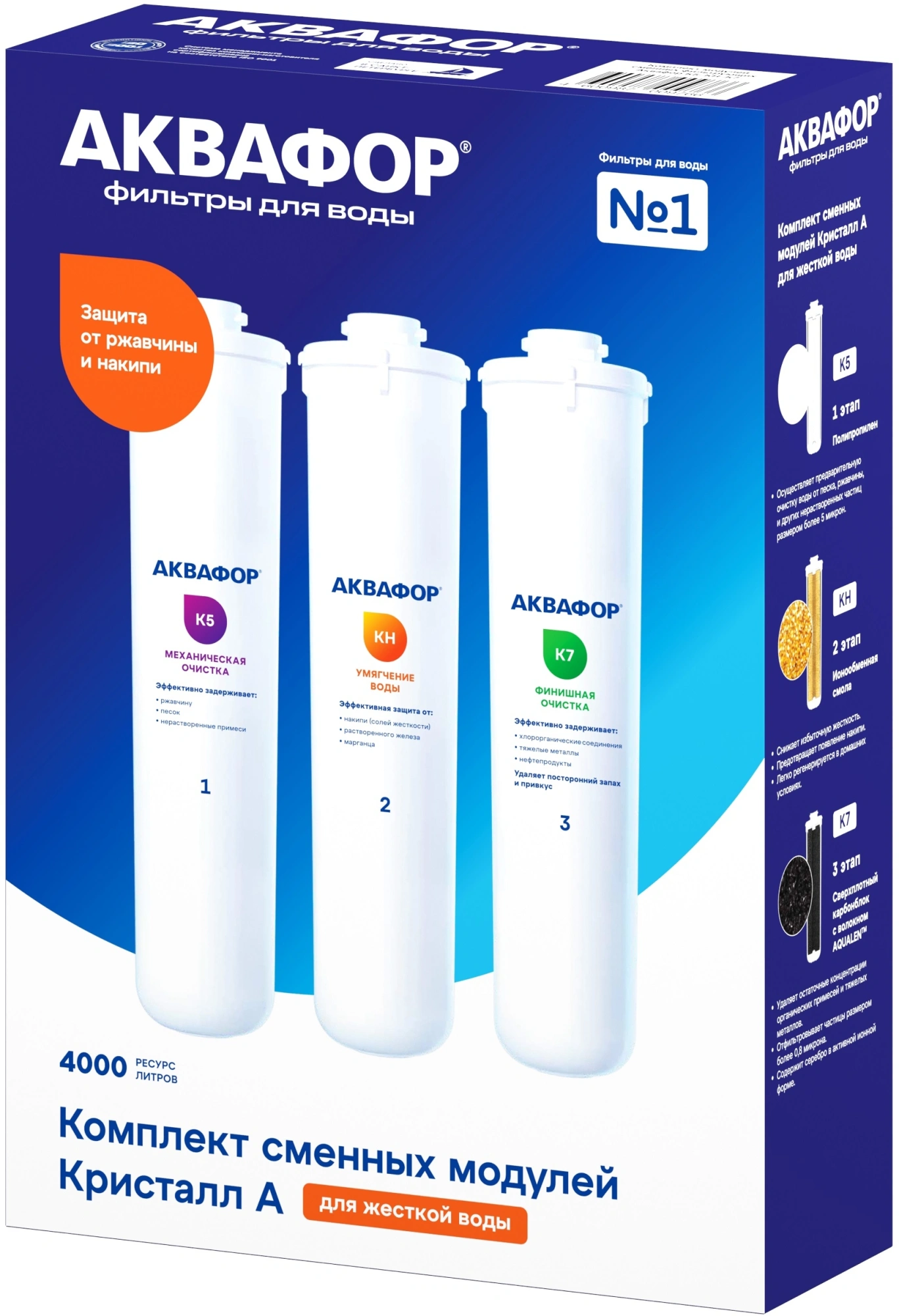 В комплект картриджей входят три модуля: K5 - предварительная очистка; KH - для умягчения воды умеренной или средней жесткости; K7 - финишная очистка.