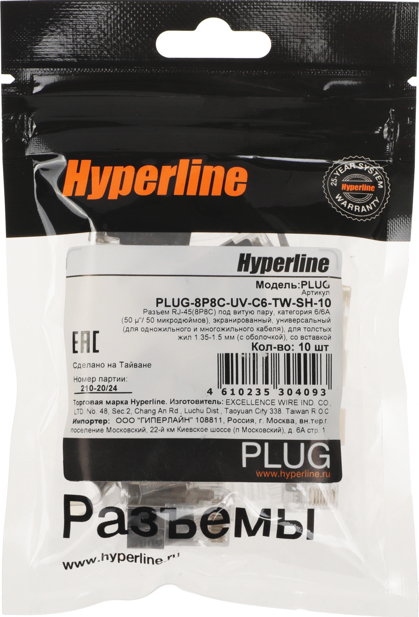 Hyperline PLUG-8P8C-UV-C6-TW-SH-10 Разъем RJ-45 (8P8C) под витую пару, категория 6/ 6A (50 µ" / 50 микродюймов) , экранированный, универсальный (для одножильного и многожильного кабеля) , для толстых жил 1.35-1.5 мм (с оболочкой) , со вставкой, (10 шт)