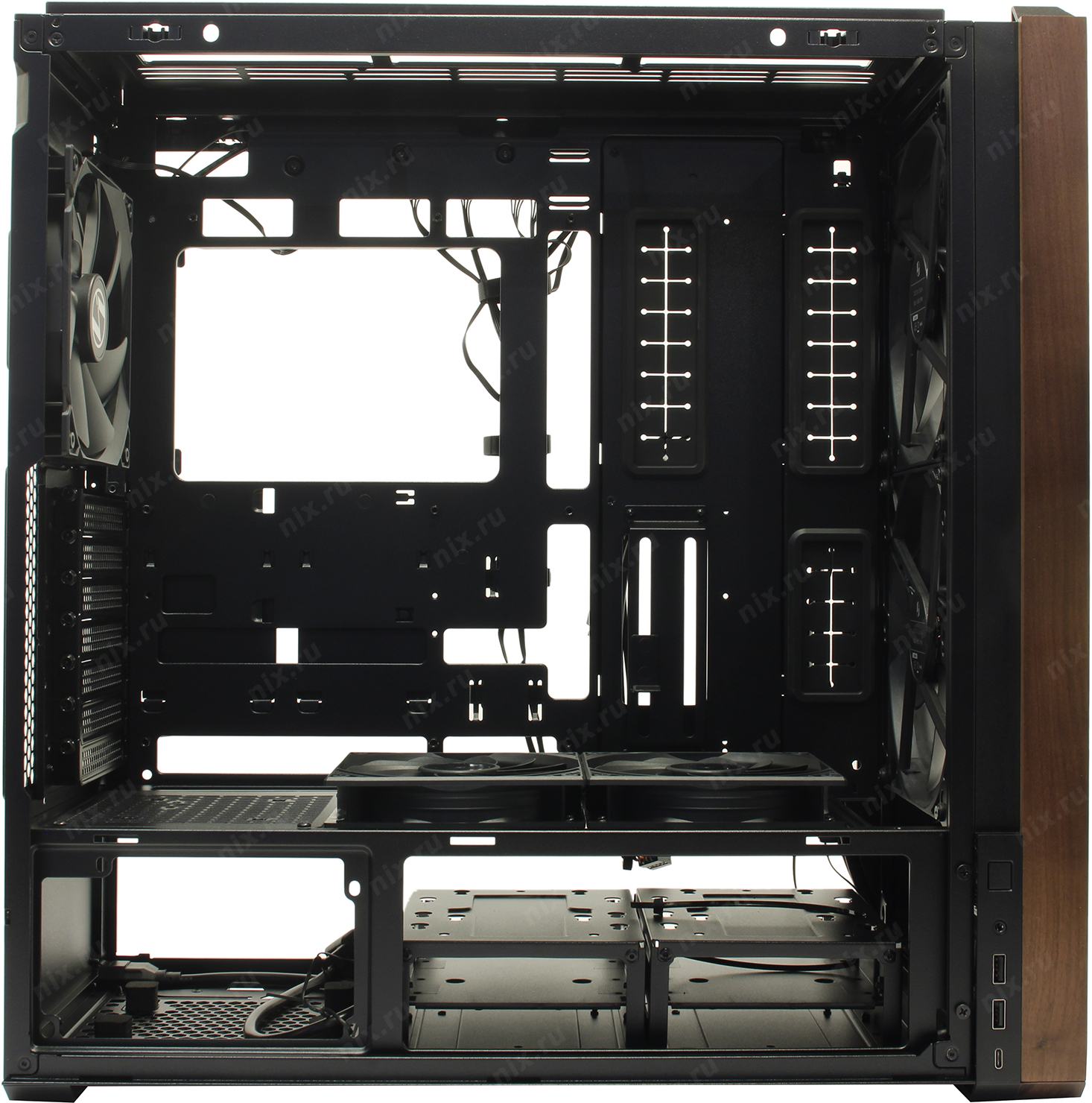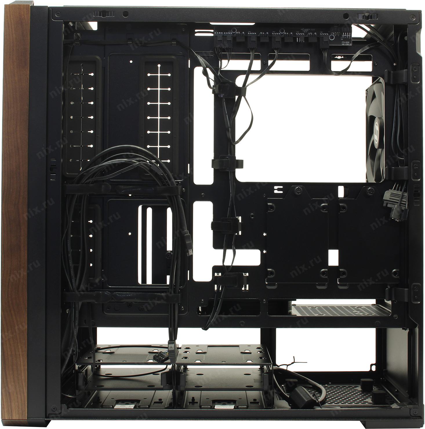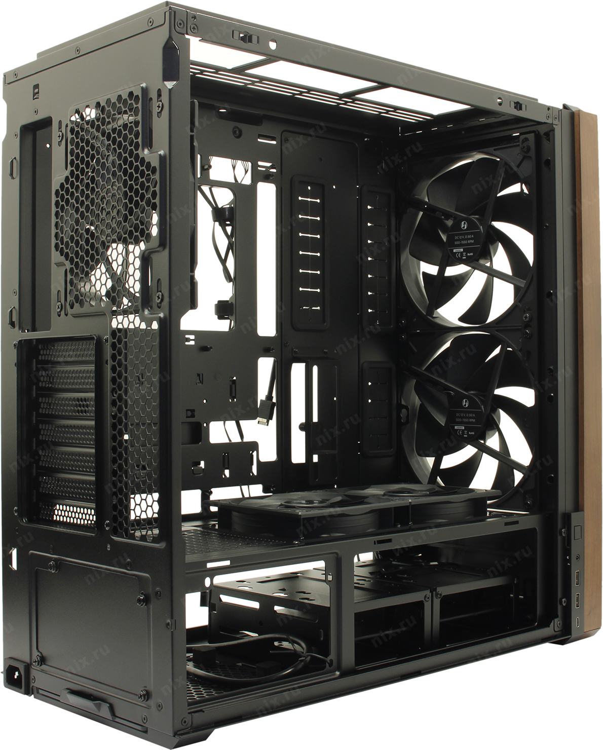 5 вентиляторов: 170 x 170, 140 x 140, 120 x 120 мм (2x 170 мм на передней, 2x 120 мм на нижней панели и 1x 140 мм на задней панели)