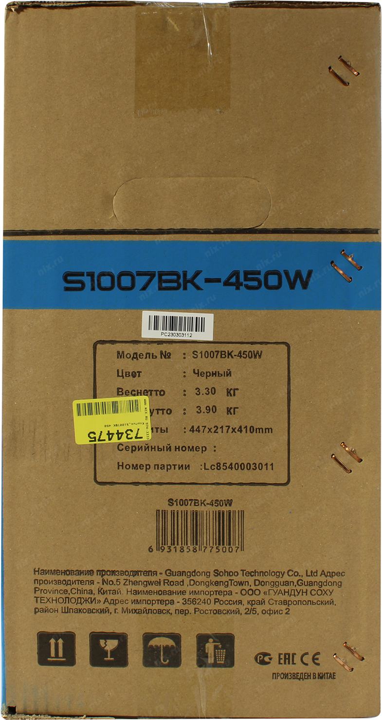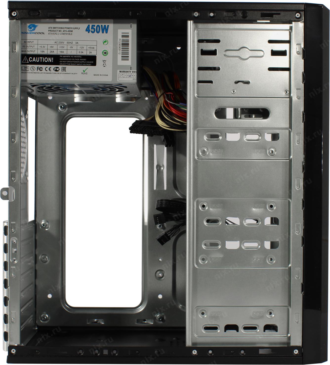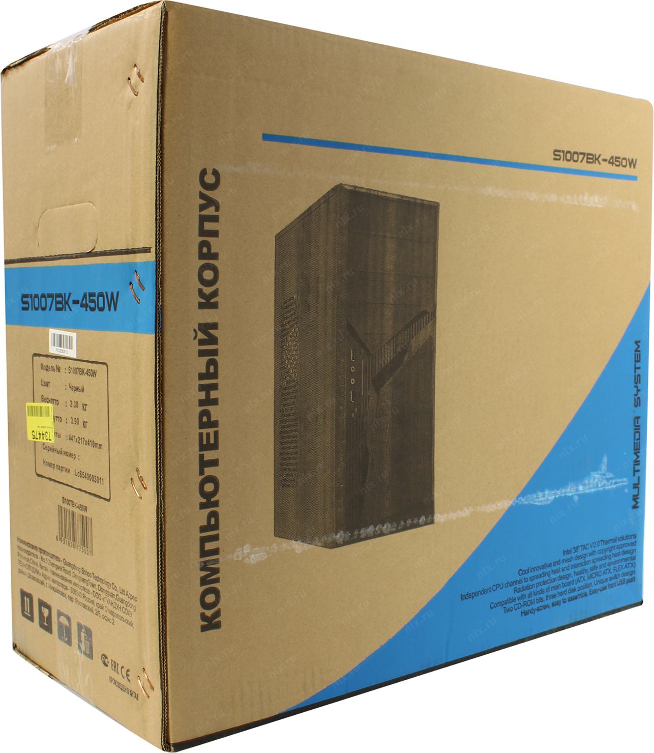 Корпус PowerCool S1007BK 450W (Тип: Midi-Tower, цвет: черный, форм-фактор: ATX, mATX, блок питания: 450 Вт, вентилятор: 120 мм, размеры: 175 x 407 x 362 мм, дополнительно: USB x2, наушники, микрофон) [S1007BK450W]