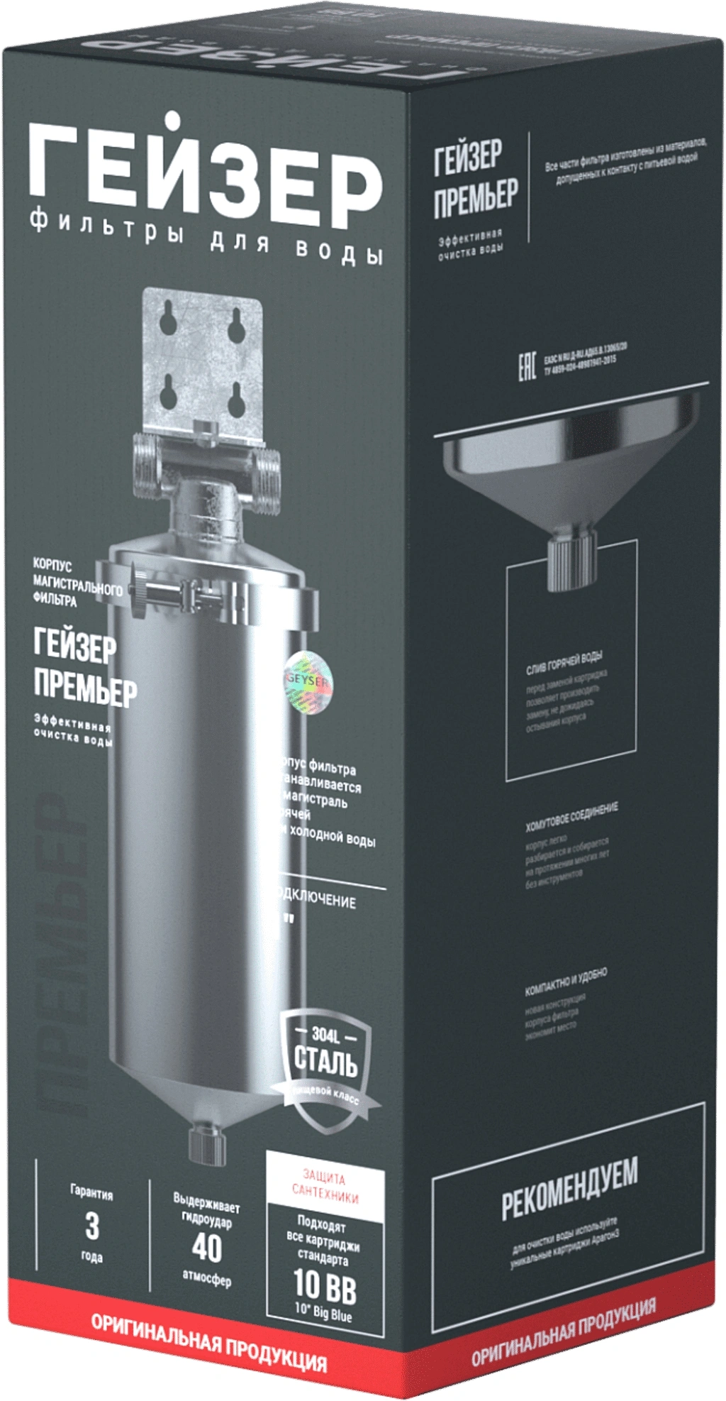 Премьер 10BB устанавливается на вход в систему горячего или холодного водоснабжения. Корпус фильтра изготовлен из высококачественной нержавеющей стали марки 304L, устойчивой к возникновению коррозии, что гарантирует многолетнюю работу фильтра. Используется с картриджами стандарта Big Blue 10" .