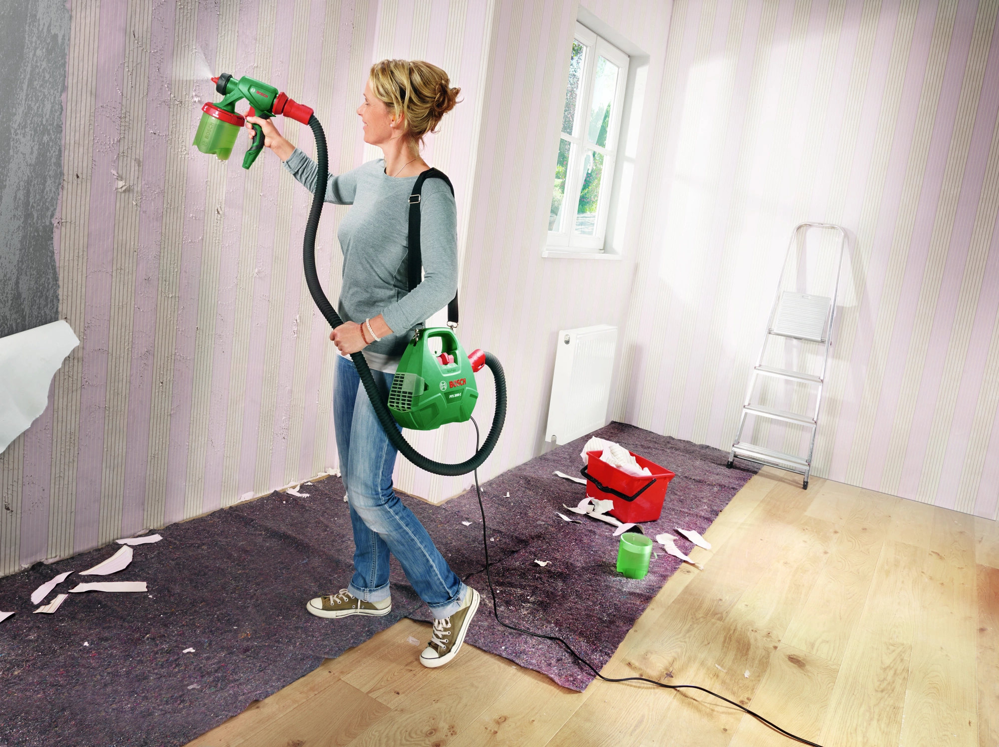 в комплекте: насадка для водоэмульсионной краски (белая) ; насадка для эмалей и лазурей (серая) ; цветной фильтр; щетка для очистки; ремень для переноски.